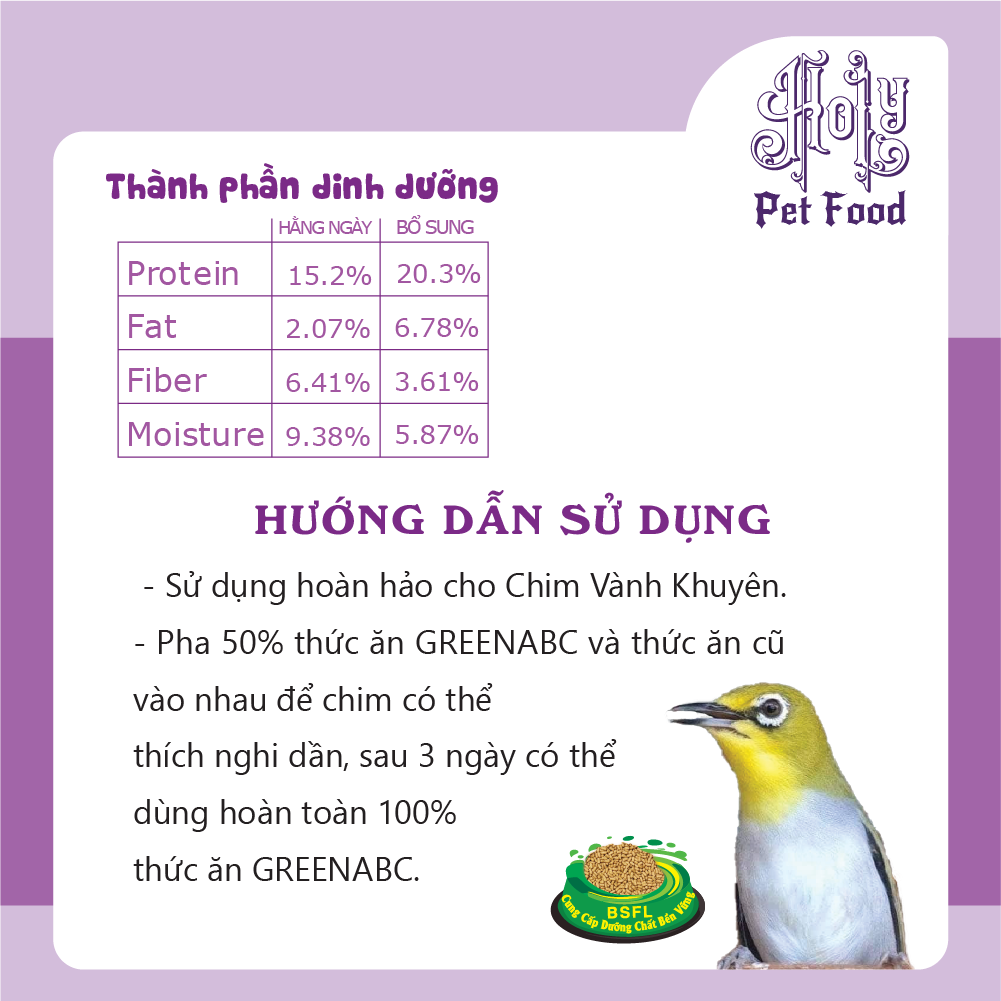 GREENABC - THỨC ĂN CHIM VÀNH KHUYÊN HÀNG NGÀY & BỔ SUNG GREENABC là thức ăn cao cấp dành cho CHIM VÀNH KHUYÊN. Đặc biệt sản phẩm GREENABC được sản xuất theo phương pháp Áp