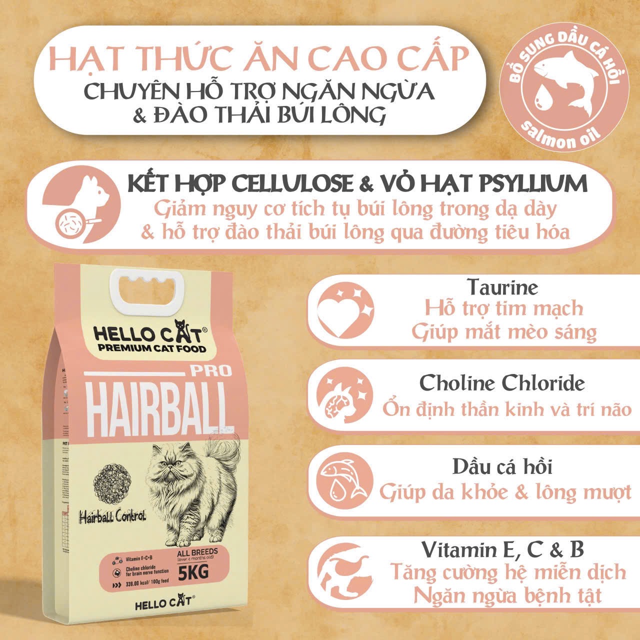 Mua tại TiktokTHỨC ĂN CHO MÈO HELLO CAT HAIRBALL 5KG Quy cách đóng gói: Bao xá 5kg Dành cho mèo trên 4 tháng tuổi Thành phần dinh dưỡng: