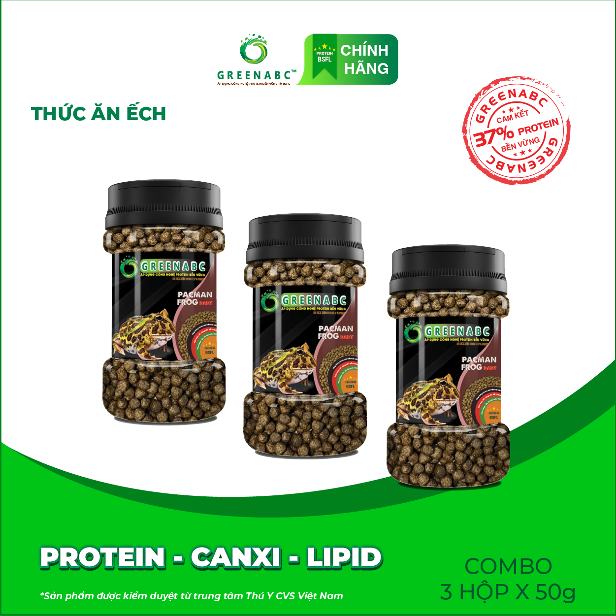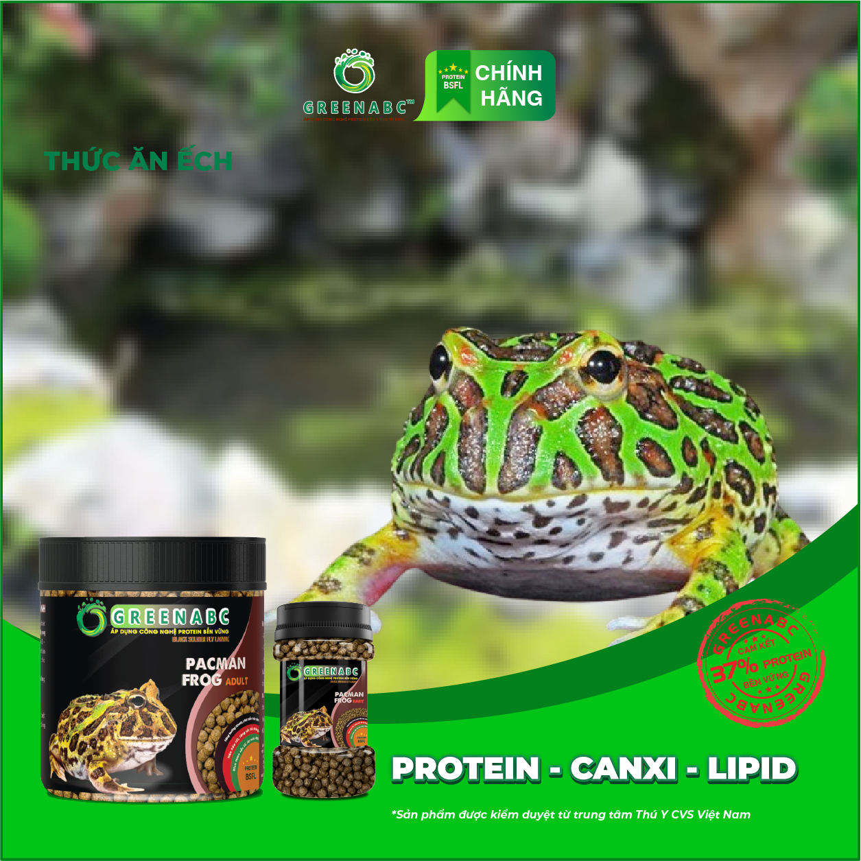 GREENABC - THỨC ĂN ẾCH PACMAN - HÀM LƯỢNG PROTEIN > 37% GREENABC là thức ăn bổ dưỡng dành cho ẾCH PACMAN. Đặc biệt sản phẩm GREENABC được sản xuất theo phương pháp Áp dụng công nghệ PROTEIN Bền Vững từ bột đạm G.Meal rất giàu PROTEIN – CANXI – LIPID có trong BSFL, đã được Mỹ (AAFCO) và EU chấp nhận đưa vào công thức cho ngành sản xuất thức ăn vật nuôi. Sản phẩm GREENABC cung cấp các giá trị dinh dưỡng bền vững cho Ếch Pacman, giúp:      + Kích thích vị giác, giúp ăn ngon miệng hơn.      + Tiêu hóa tốt, cơ thể hấp thu các dưỡng chất tối ưu. Đặc biệt với hàm lượng Protein cao, sản phẩm GREENABC giúp tăng trưởng nhanh, phát triển toàn diện.      + Kích thích sắc tố, lên màu đẹp.      + Tăng cường sức đề kháng ngăn ngừa bệnh tật.      + Cơ thể cân đối, săn chắc. Thành phần dinh dưỡng và hướng dẫn sử dụng: