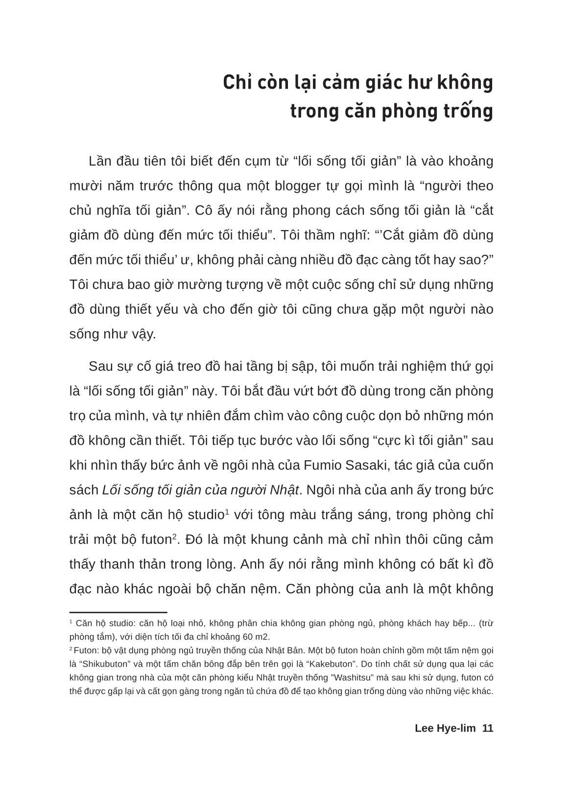 “Sống một cuộc đời chỉ toàn những thứ m.ình thích và không có bất kì sự thừa thãi lãng phí nào” là thông điệp đúc rút qua chính kinh nghiệm và trải nghiệm ròng rã hơn 10 năm của tác giả Lee Hye-lim – từ một người theo “chủ nghĩa tối đa” trở thành người có suy nghĩ “trên đời này không có đồ vật nào thực sự quan trọng”. Hơn cả những gì một cuốn sách hướng dẫn sống tối giản có thể mang lại cho bạn, Thực hành sống tối giản cung cấp cho bạn nhiều khía cạnh khác nhau về bản chất khái niệm “sống tối giản”, trong đó có tư duy “loại bỏ-lấp đầy”.