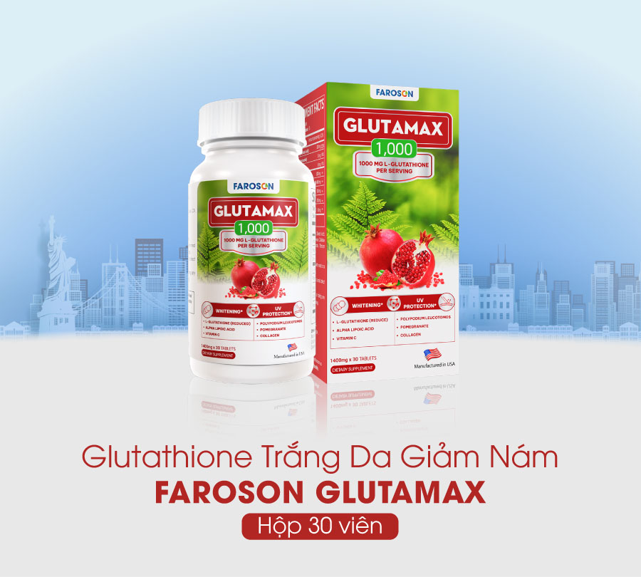 Thực Phẩm Bảo Vệ Sức Khỏe Faroson Glutamax 1000 Beauty Support From Within Hỗ Trợ Làn Da 30 Viên chứa các vitamin và dưỡng chất giúp làm sáng da, giảm nám da, bảo vệ da khỏi tia UV (ánh nắng mặt trời) và hỗ trợ tăng cường khả năng chống oxy hóa, giúp làm tăng độ đàn hồi cho da, giảm lão hóa da. Sản phẩm này không phải là thuốc, không có tác dụng thay thế thuốc chữa bệnh.
