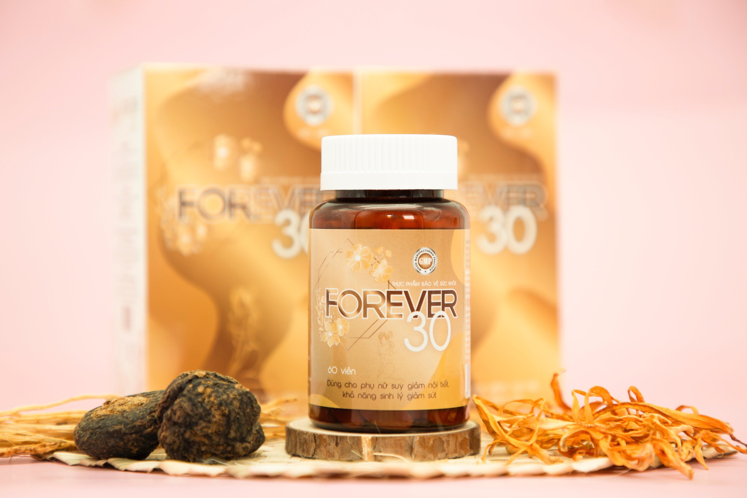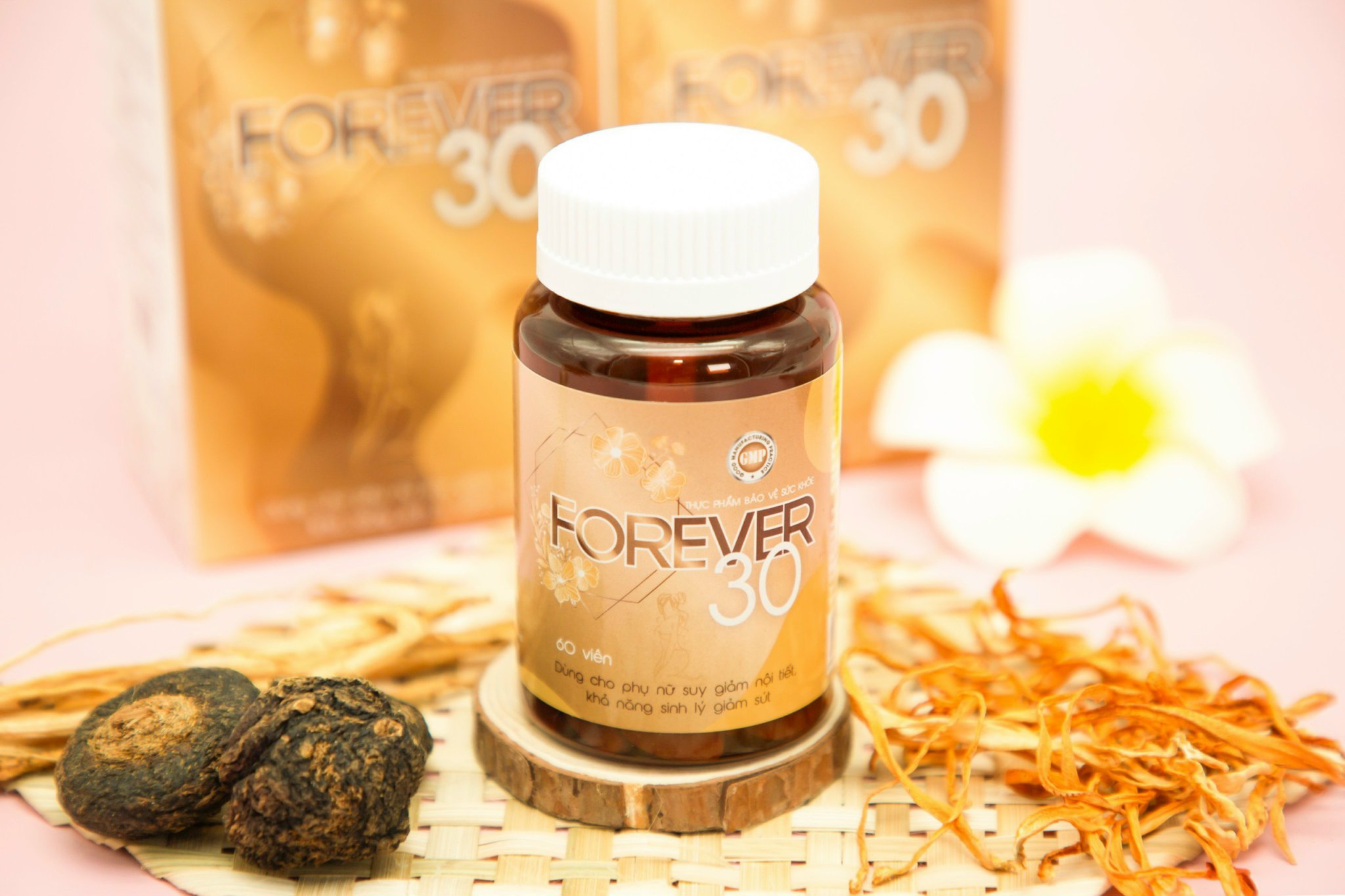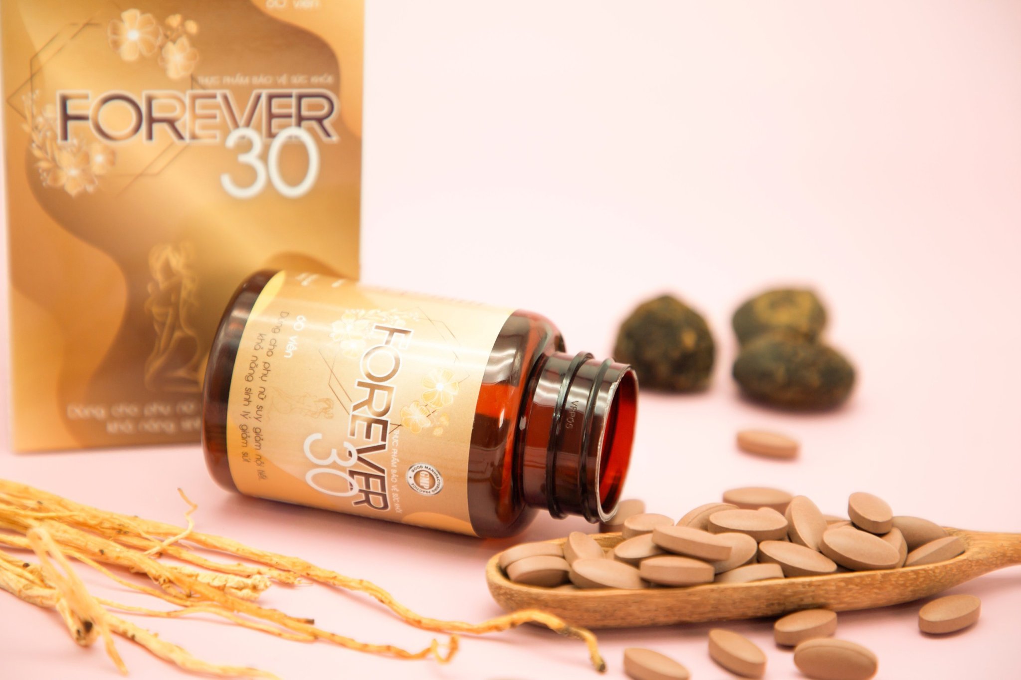 Từ những nghiên cứu chuyên sâu về các loại thảo dược, các tiến sĩ, chuyên gia đầu ngành đã đưa ra công thức có trong TPBVSK Forever30. Với thành phần chiết xuất từ các thảo dược thiên nhiên như: ích mẫu, đương quy, xuyên khung, đảng sâm … và đặc biệt là chiết xuất 2 thảo dược vô cùng giá trị là Nhân sâm Peru và Thiên môn chùm. Đặc biệt, với hoạt chất Arginine chiết xuất trong nhân sâm Peru hỗ trợ tăng cường hoạt động của tuyến yên và buồng trứng, nuôi dưỡng chức năng buồng trứng, làm khỏe từng tế bào trứng, khi tế bào trứng khỏe dẫn đến hiện tượng rụng trứng và phóng noãn đều, giúp kéo dài thời kỳ sinh sản của phụ nữ, làm chậm lại thời kỳ tiền mãn kinh. Thiên Môn Chùm được coi là “Nữ hoàng của các loại thảo mộc”. Tên khác là Shatavari mang ý nghĩa “Người phụ nữ sở hữu một trăm người chồng”. Thiên môn chùm chứa nhiều dưỡng chất, đặc biệt là Isoflavone và Phytoestrogen (chất có hoạt tính giống estrogen). Phytoestrogen giúp cân bằng lượng estrogen, tăng cường chức năng sinh lý của hệ sinh dục nữ, tuyến yên, tuyến vú, buồng trứng và một số cơ quan khác. Isoflavone có tác dụng điều hòa chu kỳ rụng trứng, tăng ham muốn tình dục, làm ẩm các mô khô của vùng kín, trẻ hóa tử cung, hỗ trợ điều trị huyết trắng và rong kinh. Ngoài tác dụng cải thiện nội tiết tố nữ, các dược chất còn hỗ trợ giảm mụn trứng cá, làm đẹp da, tăng cường sức khỏe giúp phụ nữ luôn giữ được nét đẹp như ở tuổi 30. TPBVSK Forever30 có tác dụng hiệu quả trong việc hỗ trợ tăng cường nội tiết tố nữ, giúp cải thiện các triệu chứng do thiếu hụt nội tiết tố nữ. TPBVSK Forever30 được sản xuất trên dây chuyền hiện đại đạt chuẩn GMP-WHO được Bộ Y tế cấp giấy chứng nhận và cho phép lưu hành sử dụng. Bào chế dưới dạng viên nén theo công nghệ viên nén định hình giúp các dược chất dễ tan và thấm nhanh vào cơ thể từ đó nâng cao hiệu quả của sản phẩm. Forever30 - Giải pháp cải thiện suy giảm nội tiết tố nữ