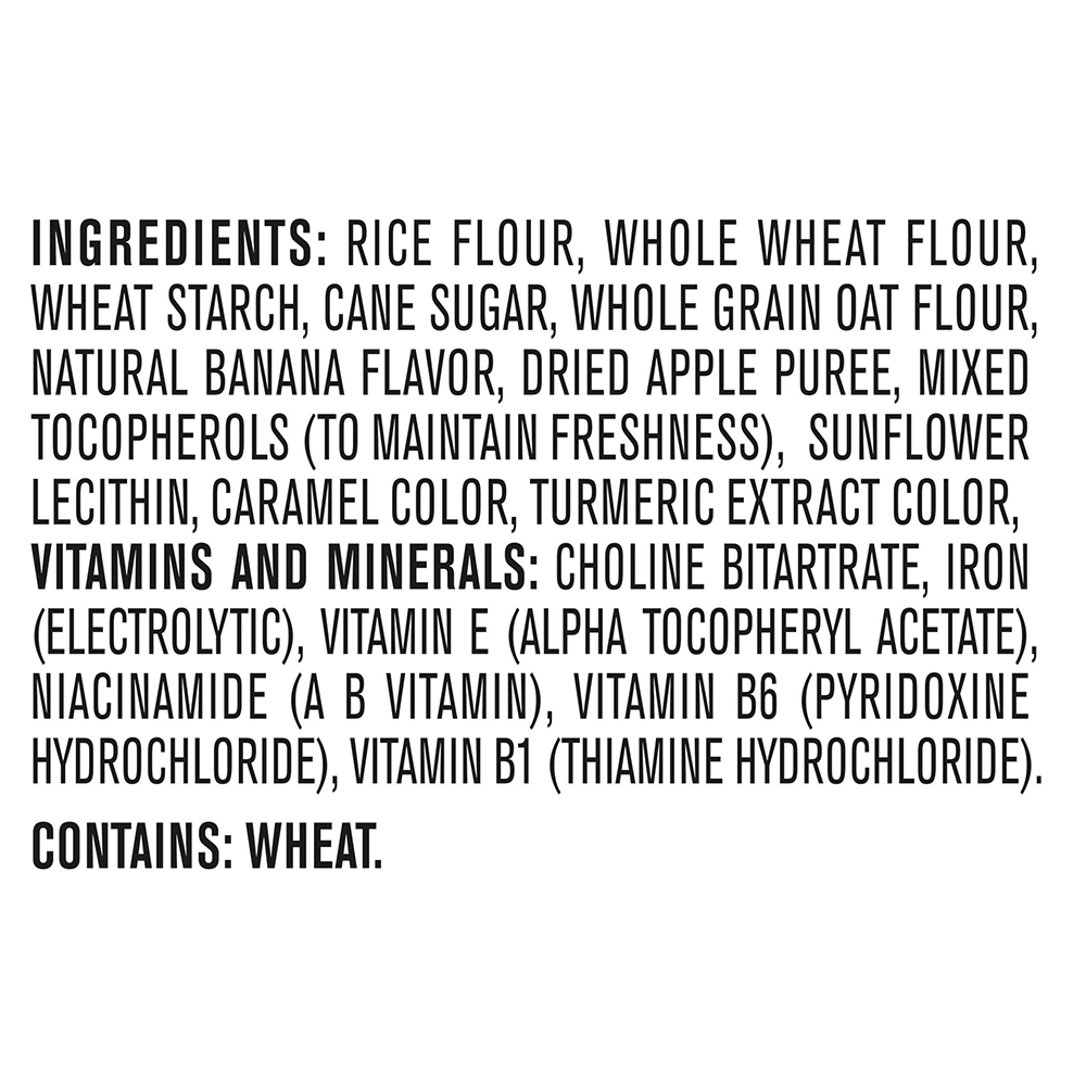Bột ngô vàng nguyên cám, bột ngô vàng, dầu hướng dương có hàm lượng Oleic cao, gia vị táo khoai lang (đường nâu, maltodextrin, đường, sữa tách béo, khoai lang sấy khô, bột táo nhuyễn, muối, chiết xuất màu tự nhiên paprika, quế, hương khoai lang tự nhiên), chất chống oxy hóa tocopherols hỗn hợp.
