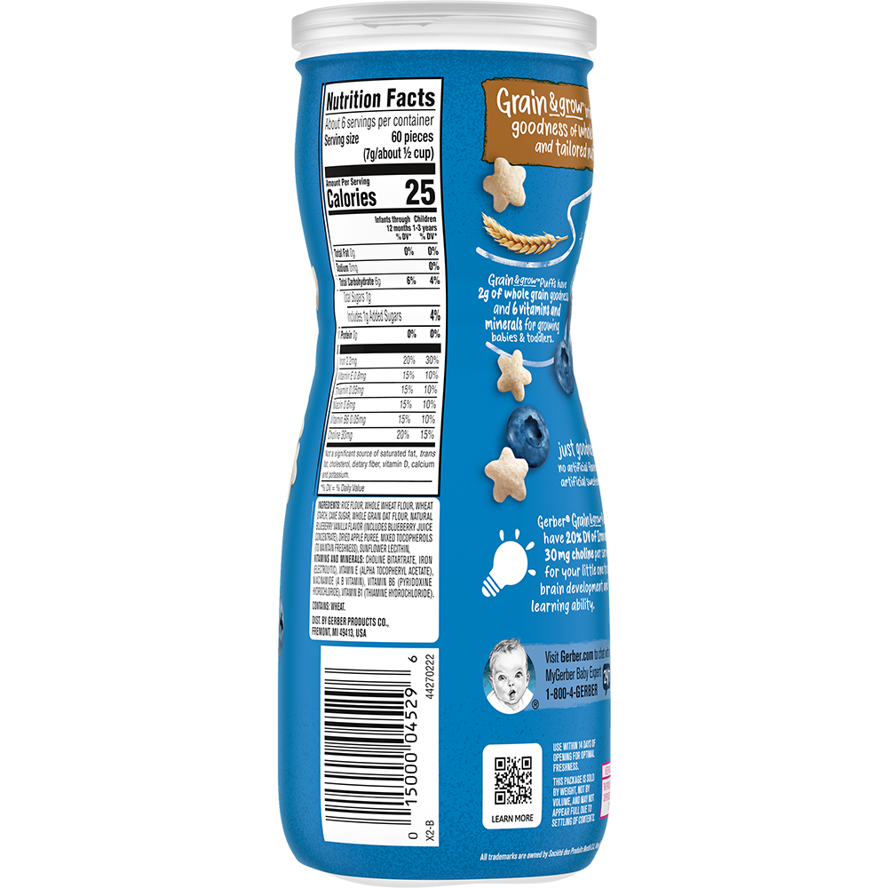 - Bột gạo, bột lúa mì nguyên cảm, tinh bột lúa mì, đường mía, bột yến mạch nguyên cám, hương liệu việt quất vani tự nhiên, bột tảo, chất chống oxy hóa tocopherol concentrat (dạng hỗn hợp), chất nhũ hóa lecithin hướng dương, choline bitartrate, sắt nguyên tổ (điện phân), d-alpha-tocopheryl acetat (vitamin E), nicotinamid, pyridoxin hydroclorid (vitamin B6), thiamin hydroclorid (vitamin B1). Ưu điểm vượt trội của bánh Gerber Puff
