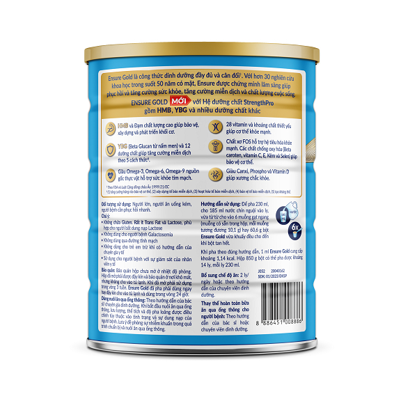 - Sử dụng cho người bệnh với sự giám sát của nhân viên y tế Dùng nuôi ăn qua ống thông: Theo hướng dẫn của bác sĩ/chuyên gia dinh dưỡng. Khi bắt đầu nuôi ăn qua ống thông, lưu lượng, thể tích và độ pha loãng được điều chỉnh tùy thuộc vào tình trạng và sự dung nạp của người bệnh. Lưu ý đề phòng sự nhiễm khuẩn trong quá trình chuẩn bị và nuôi ăn qua ống thông. Cách sử dụng: Để pha 230 ml, cho 185 ml nước chín nguội vào ly, vừa từ từ cho vào 6 muỗng gạt ngang (muỗng có sẵn trong hộp, mỗi muỗng tương đương 10,1 g) hay 60,6 g bột Ensure vừa khuấy đều cho đến khi bột tan hết. Khi pha theo đúng hướng dẫn, 1ml Ensure Glod cung cấp khoảng 1,14 kcal. Hộp 850g bột có thể pha được khoảng 14 ly, mỗi ly 230ml. Cách bảo quản: Bảo quản hộp chưa mở ở nhiệt độ phòng. Sau khi mở nắp cần sử dụng hết trong vòng 3 tuần. Đậy nắp kín sau mỗi lần sử dụng, để nơi khô mát (không cho vào tủ lạnh) Hạn sử dụng: 720 ngày từ ngày sản xuất Sản xuất tại Singapore