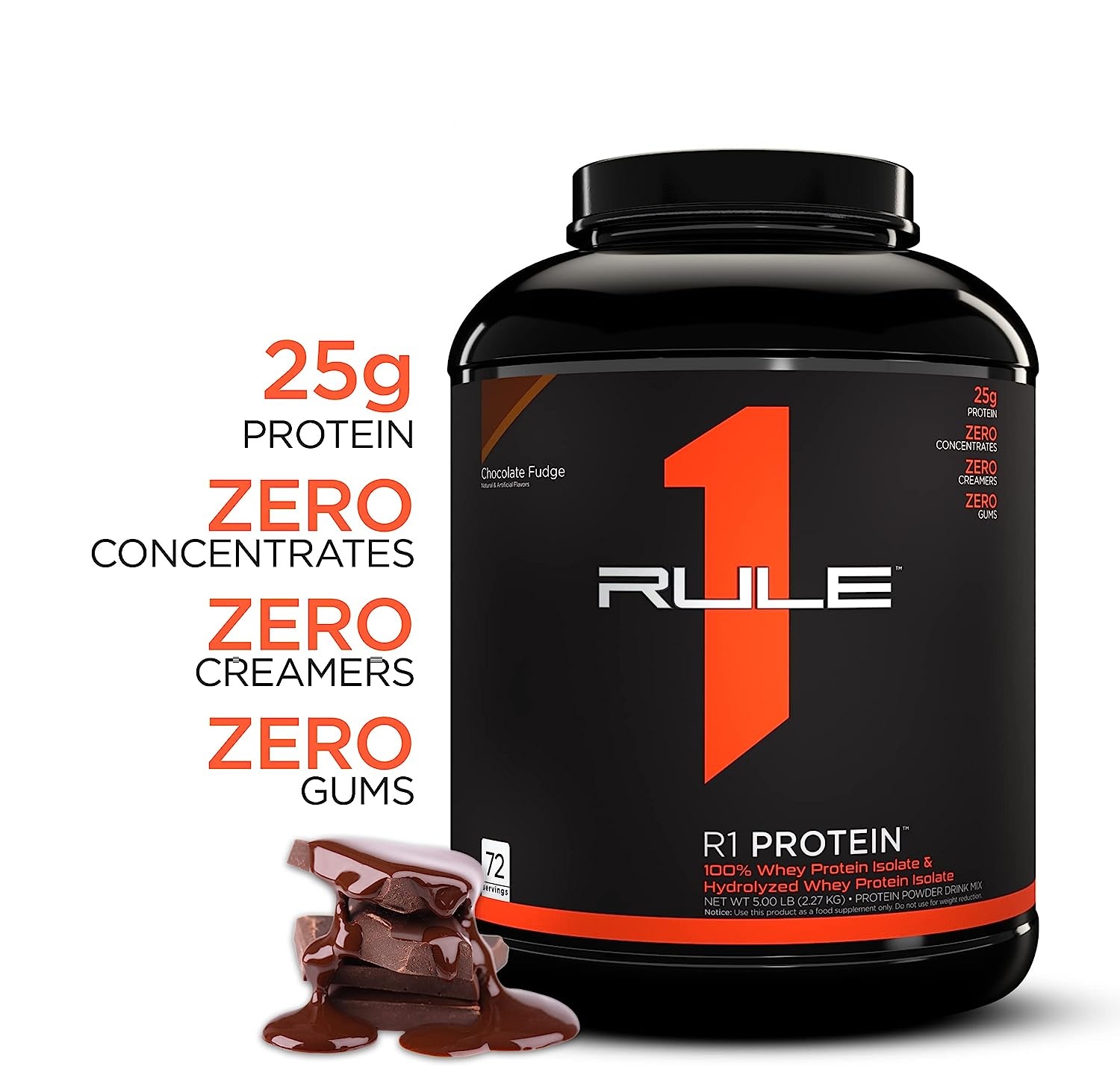 - Rule 1 Whey protein isolate chứa 25 gam mỗi khẩu phần, với 100% whey cô lập , whey thủy phân hiệu quả nhanh, hơn 6 gam BCAAs và hầu như không có gì khác.