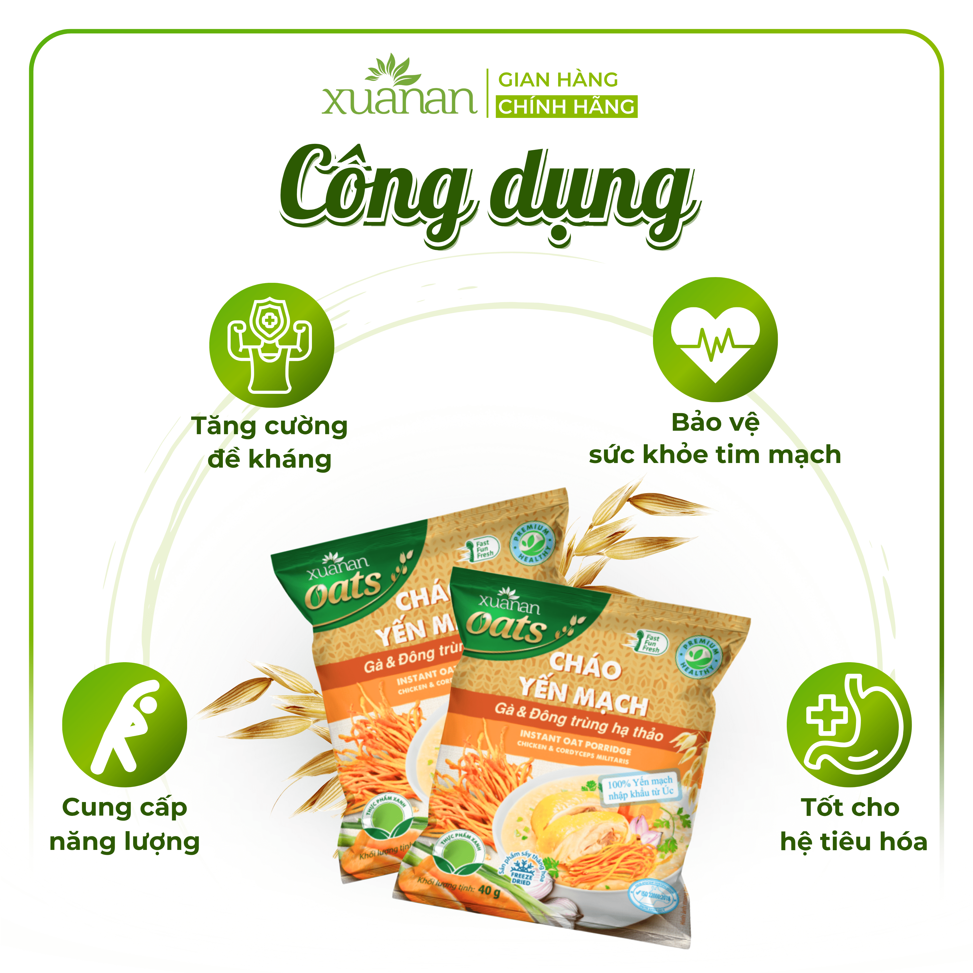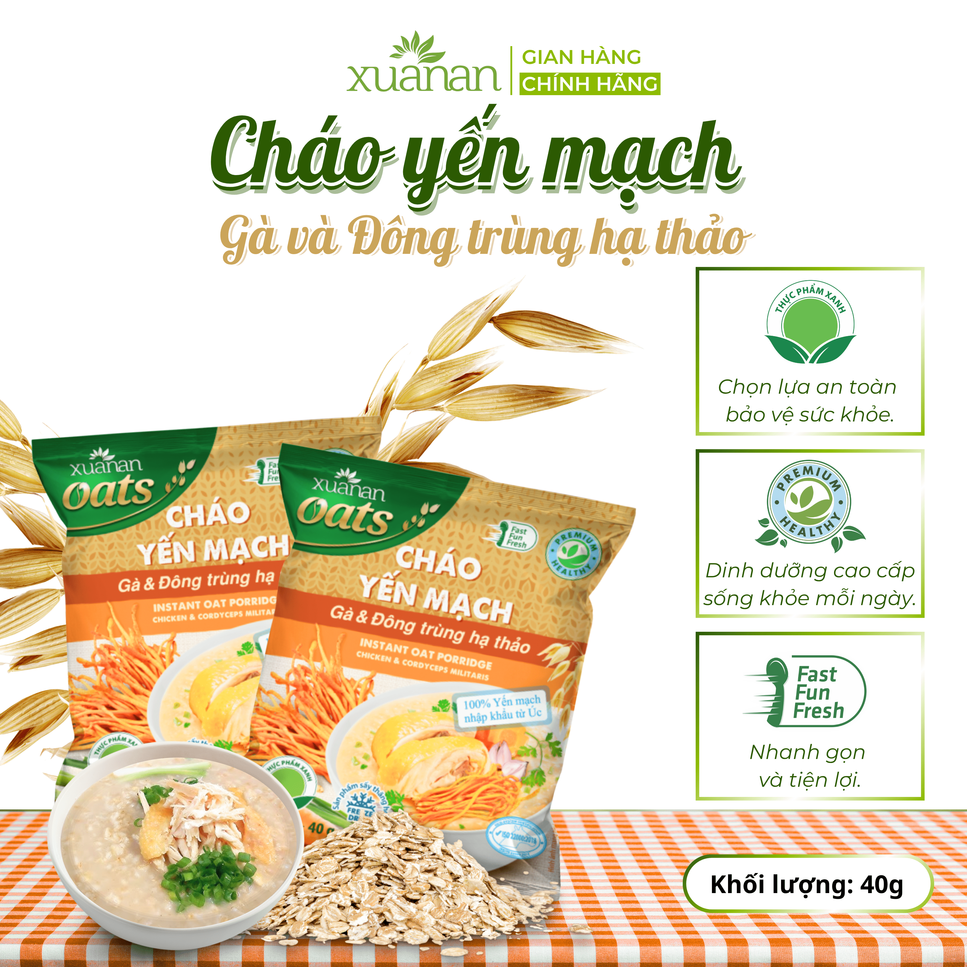 COMBO 6 GÓI CHÁO YẾN MẠCH – THỊT GÀ & ĐÔNG TRÙNG HẠ THẢO GÓI 40GR Giá trị dinh dưỡng cho 1 gói cháo 40g Chất đạm g 3.7 – 5.0 Chất xơ g 2.0 – 2.8 Năng lượng Kcal 24.9 – 33.8 Chất béo g 2.5 – 3.4 Carbohydrate g 6.2 8.4 Thành phần: – Gói cháo yến mạch nguyên chất (60%), phôi cháo gạo. – Gói rau củ: thịt gà sợi sấy thăng hoa (14%), đông trùng hạ thảo sấy thăng hoa (5%), cà rốt sấy thăng hoa, hành lá sấy. – Gói soup bột: bột hạt nêm gà ta, muối i-ốt, đường, bột tiêu, bột gừng, bột gia vị, hương tổng hợp dùng cho thực phẩm. Bảo quản: Bảo quản nơi khô ráo, thoáng mát, tránh ánh nắng trực tiếp. Đối tượng sử dụng: Người trưởng thành và trẻ em trên 36 tháng tuổi. Hướng dẫn sử dụng: - Cho gói cháo, gói soup bột và gói rau củ vào tô. - Chế nước vừa đun sôi vào tô (khoảng 350ml) - Đậy kín tô để trong 3 phút. Mở nắp tô, trộn đều là dùng được ngay. Thông tin cảnh báo: Không sử dụng khi hết hạn ghi trên bao bì hoặc có dấu hiệu bất thường như mốc, hay có côn trùng xâm nhập vào bao bì. Quy cách đóng gói: 40g/ gói – 30 gói/ thùng. Hạn sử dụng: 9 tháng kể từ ngày sản xuất