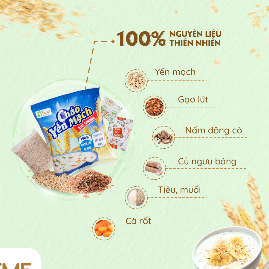 Thành phần: Yến mạch (50%), gạo lứt (40%), củ ngưu báng, nấm đông cô, cà rốt, gia vị: muối, hành, tiêu