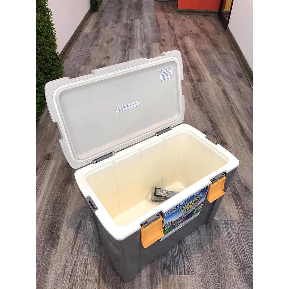 Thùng được thiết kế 2 lớp ngăn nhiệt, ngăn rộng rãi thuận lợi chứa nhiều đồ ăn, thức uống cần giữ lạnh. Có nắp đậy, chốt khóa chặt chẽ để không khí bên ngoài không tràn vào bên trong. Tay cầm vững chắc dễ vận chuyển.