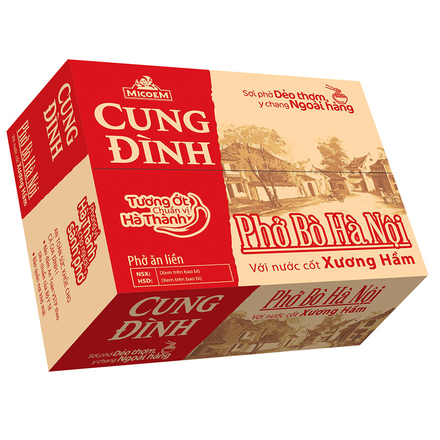 - Thùng 12 Hộp Phở Bò Hà Nội Cung Đình với nước cốt xương hầm và tương ớt chuẩn vị Hà Thành, chỉ cần vài phút cho khâu chuẩn bị và chế biến là đã