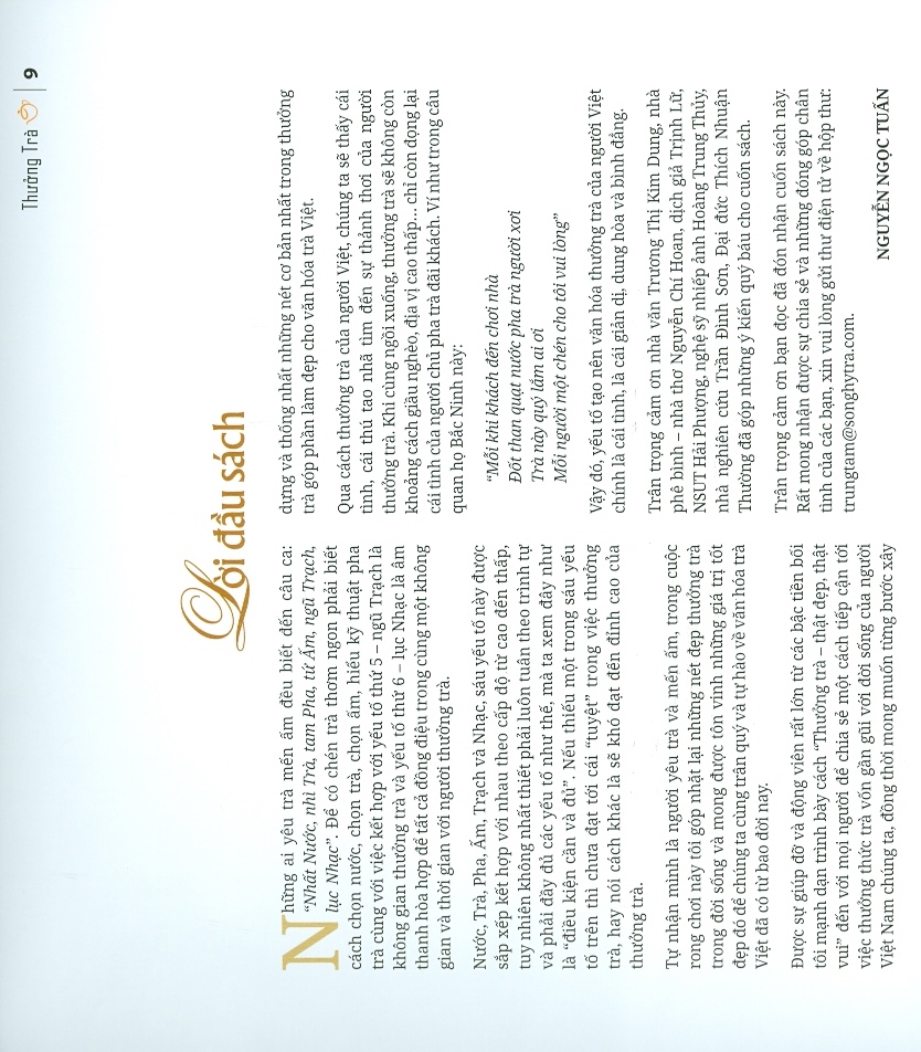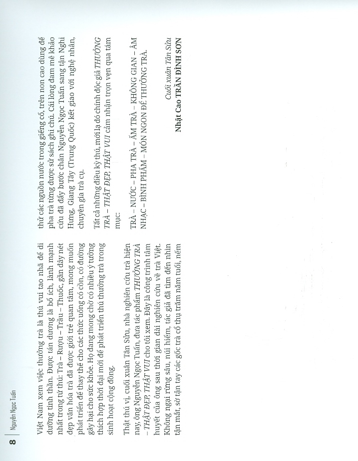 "Bạn chưa uống trà, hãy đọc để thấy sự kỳ diệu của trà, một thức uống được ưa thích sau nước. Bạn thường uống trà, hãy đọc để xem mình thưởng trà như thế nào, và tìm cho mình chén trà hoàn mỹ." - Nguyễn Ngọc Tuấn