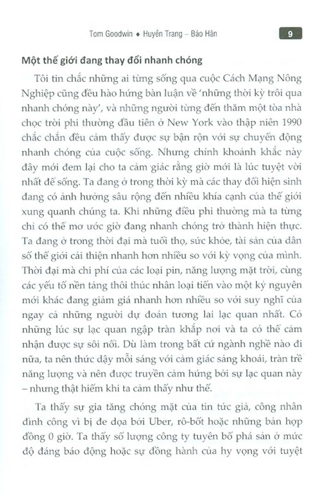 Tom Goodwin đã soi sáng đường đến tương lai bằng cách nghiên cứu về công nghệ, xã hội, cùng nhiều bài học trong quá khứ để giúp bạn biết cách thích nghi như thế nào, nên tận dụng cái gì, bỏ qua cái gì. Để giúp bạn thay đổi tư duy của mình, Goodwin đã chứng minh những giả định, dự đoán mà giới kinh doanh trước đây từng đưa ra về công nghệ số là sai ra sao. Nếu muốn công ty mình thành công trong thời kỳ hậu kỹ thuật số, bạn cần được khai sáng bởi Thuyết Tiến Hóa Công Nghệ Số.