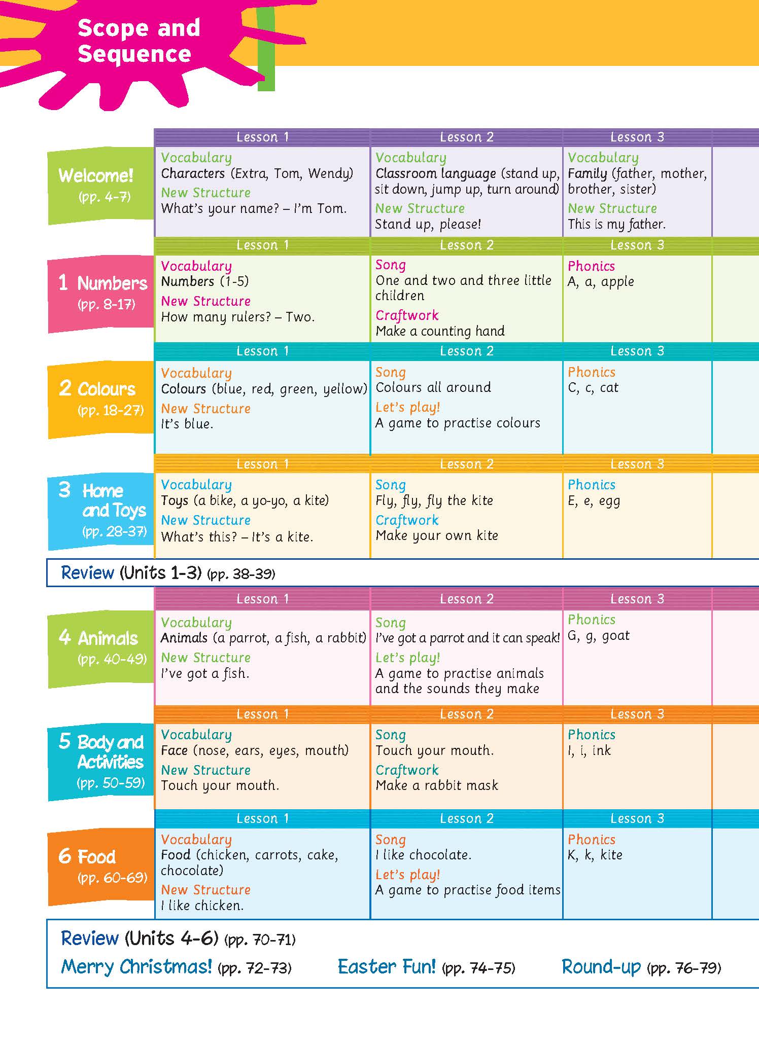 Sách: Learning English 4 - Dành Cho Học Sinh Lớp 4 NỘI DUNG VÀ CẤU TRÚC CỦA QUYỂN SÁCH : Bảng mục lục: Chỉ rõ các mục tiêu chính và trọng tâm của mỗi bài