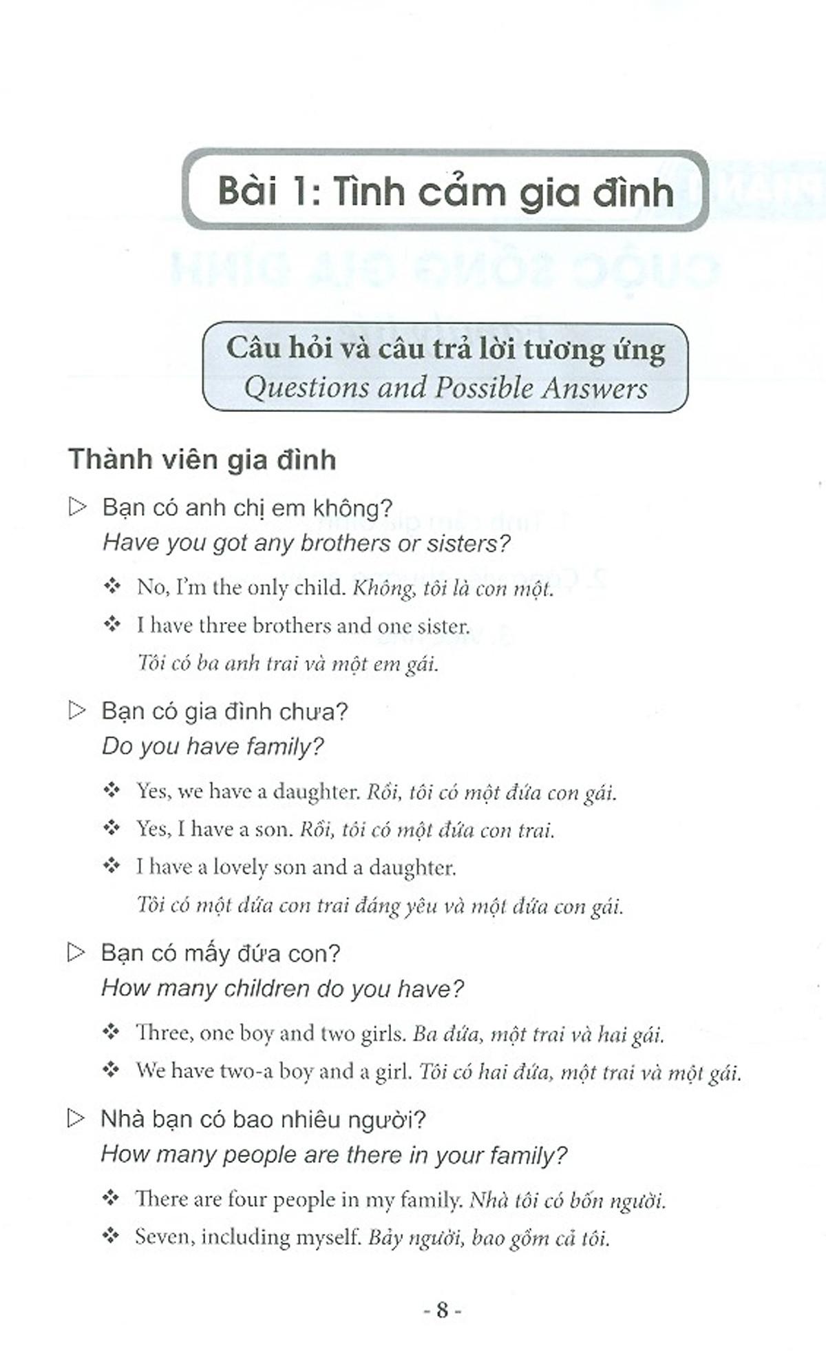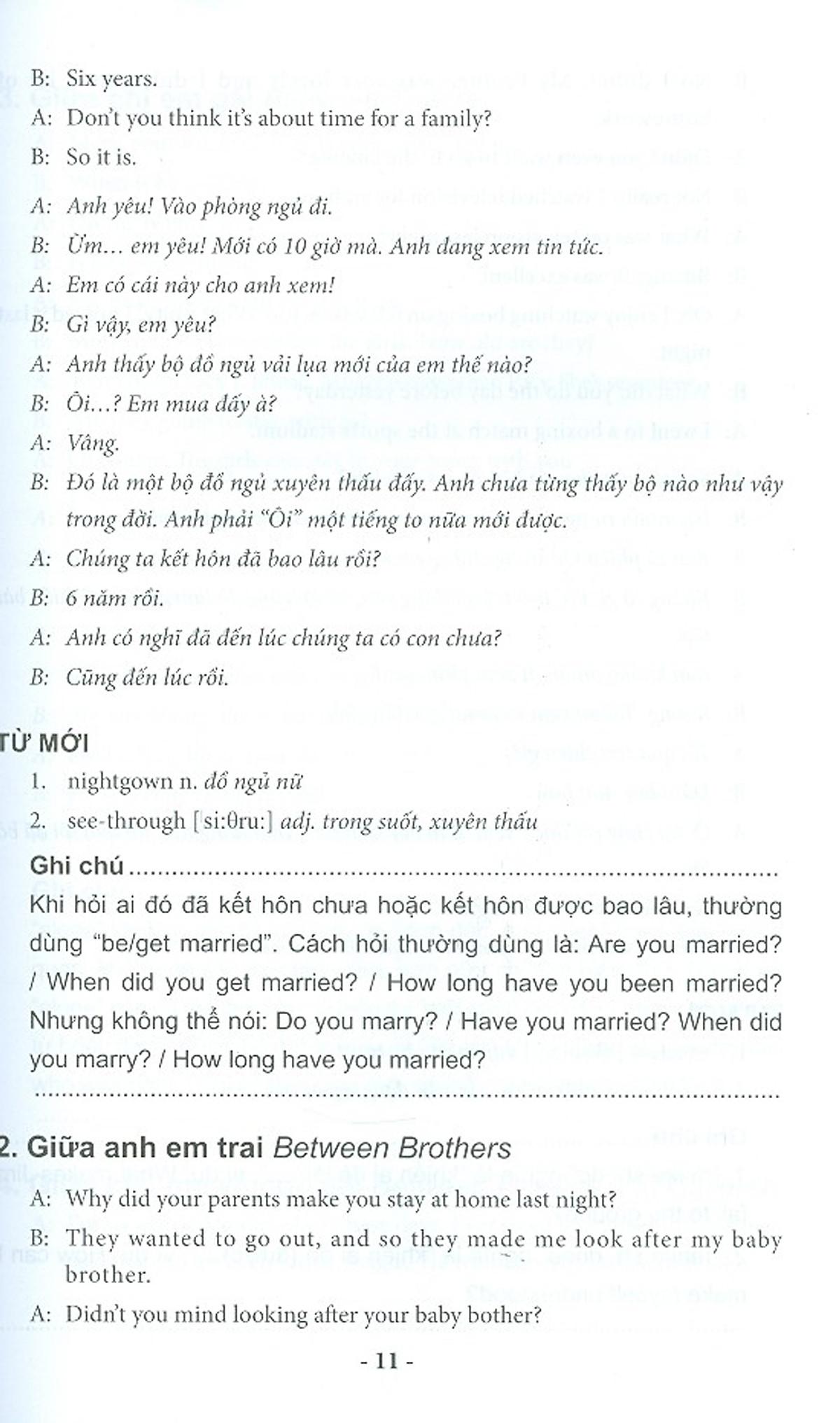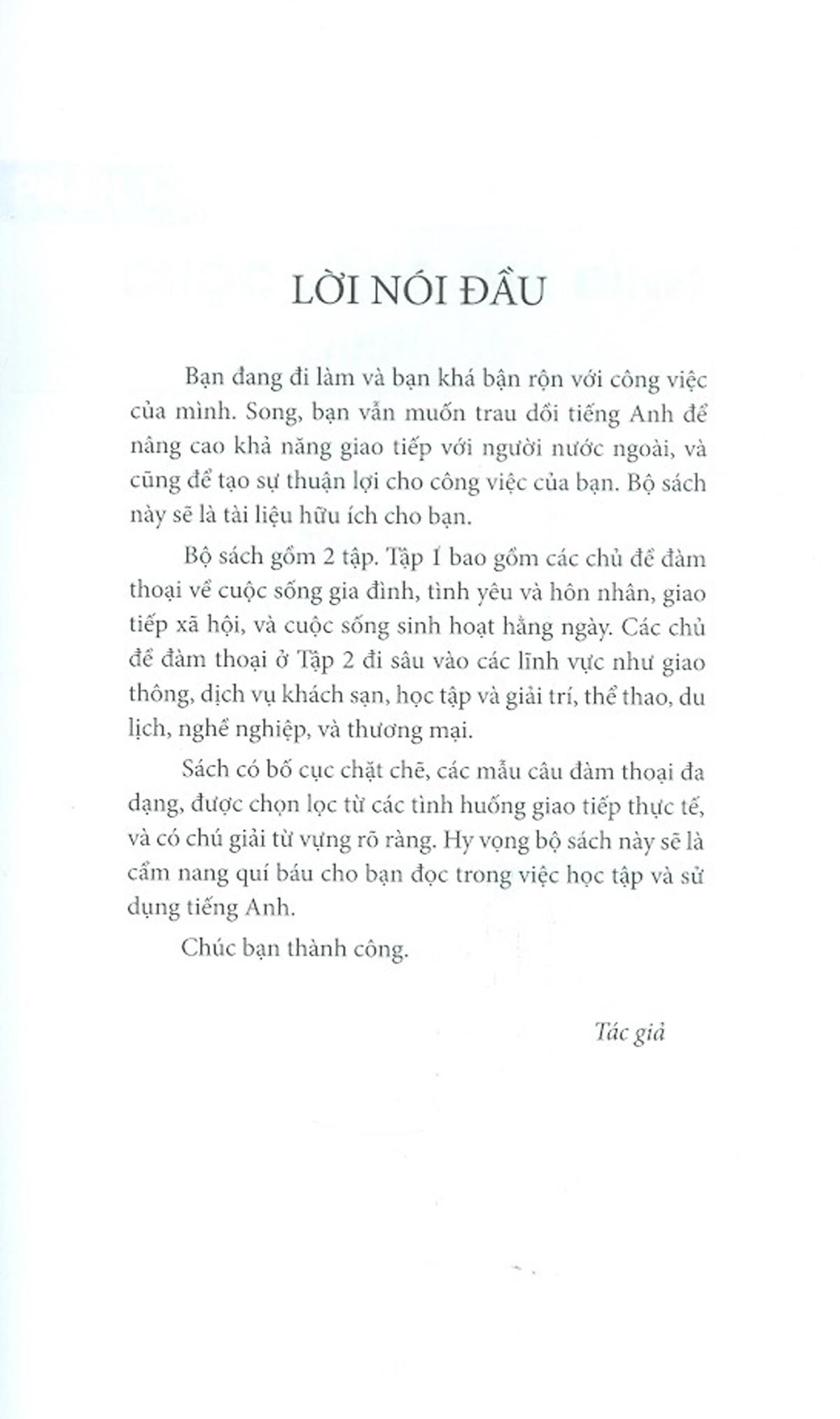 Sách có bố cục chặt chẽ, các mẫu câu đàm thoại đa dạng, được chọn lọc từ các tình huống giao tiếp thực tế, và có chú giải từ vựng rõ ràng. Hy vọng bộ sách này sẽ là cẩm nang quí báu cho bạn đọc trong việc học tập và sử dụng tiếng Anh.
