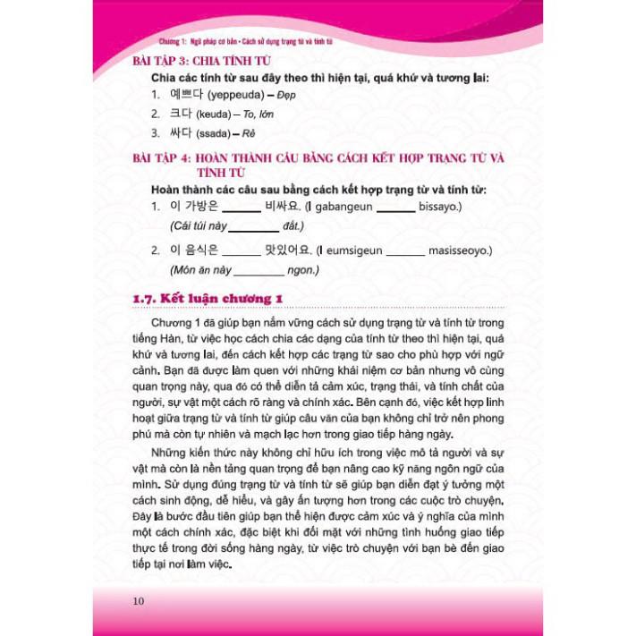 Nội dung sách bao gồm các bài học về ngữ pháp, từ vựng và các mẫu hội thoại thực tế. Từng chương được xây dựng để bạn dần nắm vững các chủ điểm quan trọng như cách sử dụng câu phức, câu điều kiện, kính ngữ, và cách biểu đạt cảm xúc, suy nghĩ trong nhiều bối cảnh khác nhau. Bên cạnh đó, bạn sẽ được tiếp cận với các chủ đề phong phú về văn hóa Hàn Quốc, từ phong tục tập quán, lối sống, cho đến các giá trị truyền thống và hiện đại. Những kiến thức này không chỉ giúp bạn hiểu sâu hơn về ngôn ngữ mà còn kết nối với văn hóa và con người Hàn Quốc một cách chân thực hơn.