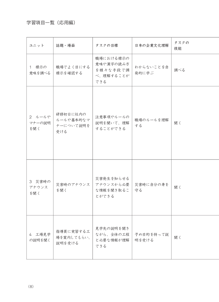 Giáo trình giúp học viên biết cách sử dụng tiếng Nhật chính xác trong các tình huống và bối cảnh thường gặp trong thực tế tại các công ty, nhà máy ở Nhật Bản. Ngoài ra, học viên cũng phát triển dần kỹ năng đặt vấn đề nghi vấn "tại sao", "như thế nào" đối với các tình huống, bối cảnh được đặt ra trong giáo trình, qua đó nắm bắt sâu sắc hơn về văn hóa doanh nghiệp Nhật Bản.