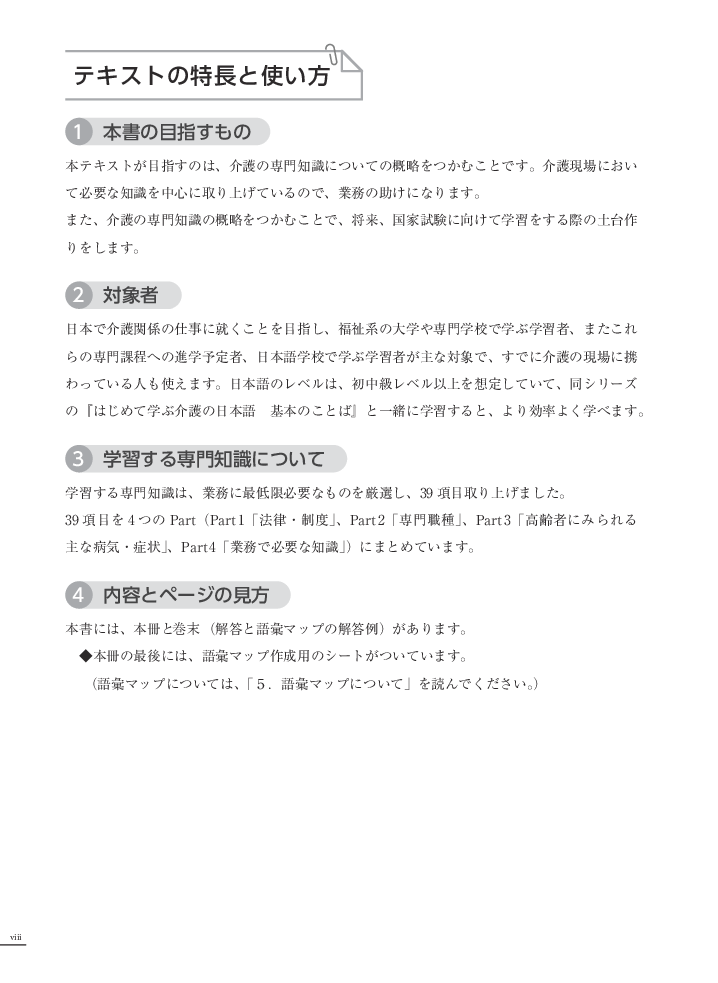 Nằm trong bộ sách “Tiếng Nhật chuyên ngành điều dưỡng”, bao gồm “Từ vựng cơ bản”, “Kiến thức cơ bản” và “Kiến thức đời sống và Giao tiếp”. Quyển "Kiến thức cơ bản" này là tổng hợp những kiến thức chuyên ngành chăm sóc điều dưỡng, bao gồm “Luật pháp – Chế độ”, “Ngành nghề chuyên môn”, “Bệnh chứng thường thấy ở người cao tuổi” và “Kiến thức cần thiết trong công việc” . Sách còn có “Sơ đồ từ vựng” giúp người học có thể sắp xếp lại kiến thức đã học. Đây là giáo trình rất bổ ích cho những người đang học ngành chăm sóc điều dưỡng, hoặc muốn làm việc trong ngành chăm sóc điều dưỡng tại Nhật Bản.