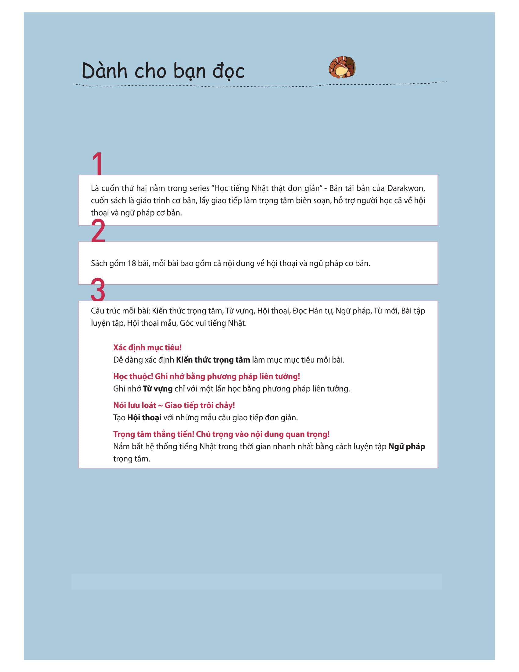 – Đây là cuốn sách thứ hai nằm trong series “Học tiếng Nhật thật là đơn giản” – Bản tái bản của Darakwon. Cuốn sách là giáo trình cơ bản, lấy giao tiếp làm trọng tâm biên soạn, hỗ trợ người học cả về hội thoại và ngữ pháp cơ bản