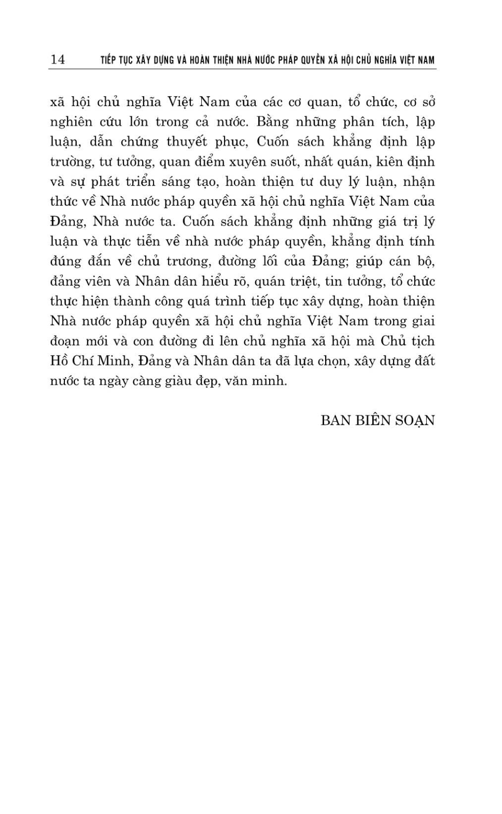 Cuốn sách Tiếp tục xây dựng và hoàn thiện nhà nước pháp quyền xã hội chủ nghĩa Việt Nam do Ban Nội chính Trung ương biên soạn nghiên cứu những vấn đề lý luận và thực tiễn nhằm nhận diện rõ nội hàm, đặc trưng và định hướng trong xây dựng, hoàn thiện Nhà nước pháp quyền xã hội chủ nghĩa Việt Nam phù hợp với điều kiện thực tiễn theo tinh thần của Cương lĩnh xây dựng đất nước trong thời kỳ quá độ lên chủ nghĩa xã hội (Bổ sung, phát triển năm 2011), Hiến pháp, các văn kiện từ Đại hội lần thứ VII đến nay và đặc biệt là cuốn sách đề cập các vấn đề quan trọng cần giải quyết để đạt được những mục tiêu được nêu trong Nghị quyết số 27-NQ/TW ngày 09 tháng 11 năm 2022 của Hội nghị lần thứ sáu Ban Chấp hành Trung ương Đảng khóa XIII về tiếp tục xây dựng và hoàn thiện Nhà nước pháp quyền xã hội chủ nghĩa Việt Nam trong giai đoạn mới. Cuốn sách gồm 3 chương: