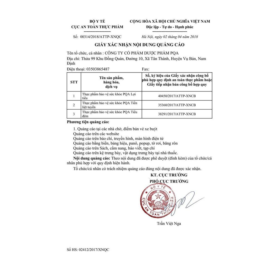 - Địa chỉ sản xuất: Công ty Cổ phần Dược phẩm PQA. Thửa 99, Khu Đồng Quàn, Xã Tân Thành, Huyện Vụ Bản, Tỉnh Nam Định. THÀNH PHẦN: