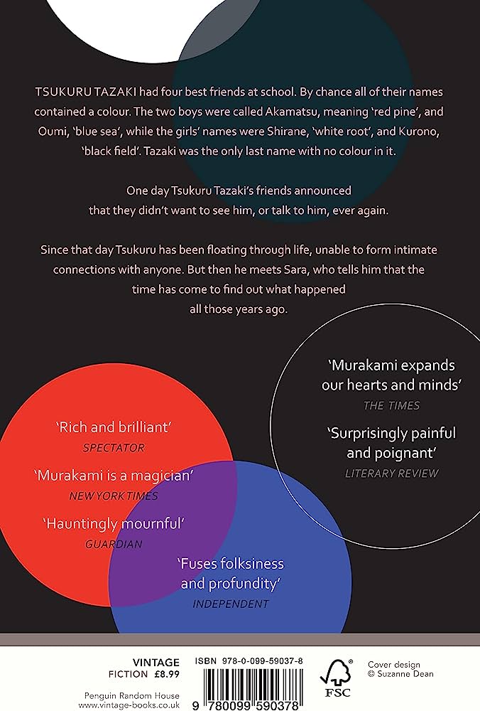 Tazaki was the only last name with no colour in it. One day Tsukuru Tazaki's friends announced that they didn't want to see him, or talk to him, ever again. Since that day Tsukuru has been floating through life, unable to form intimate connections with anyone.