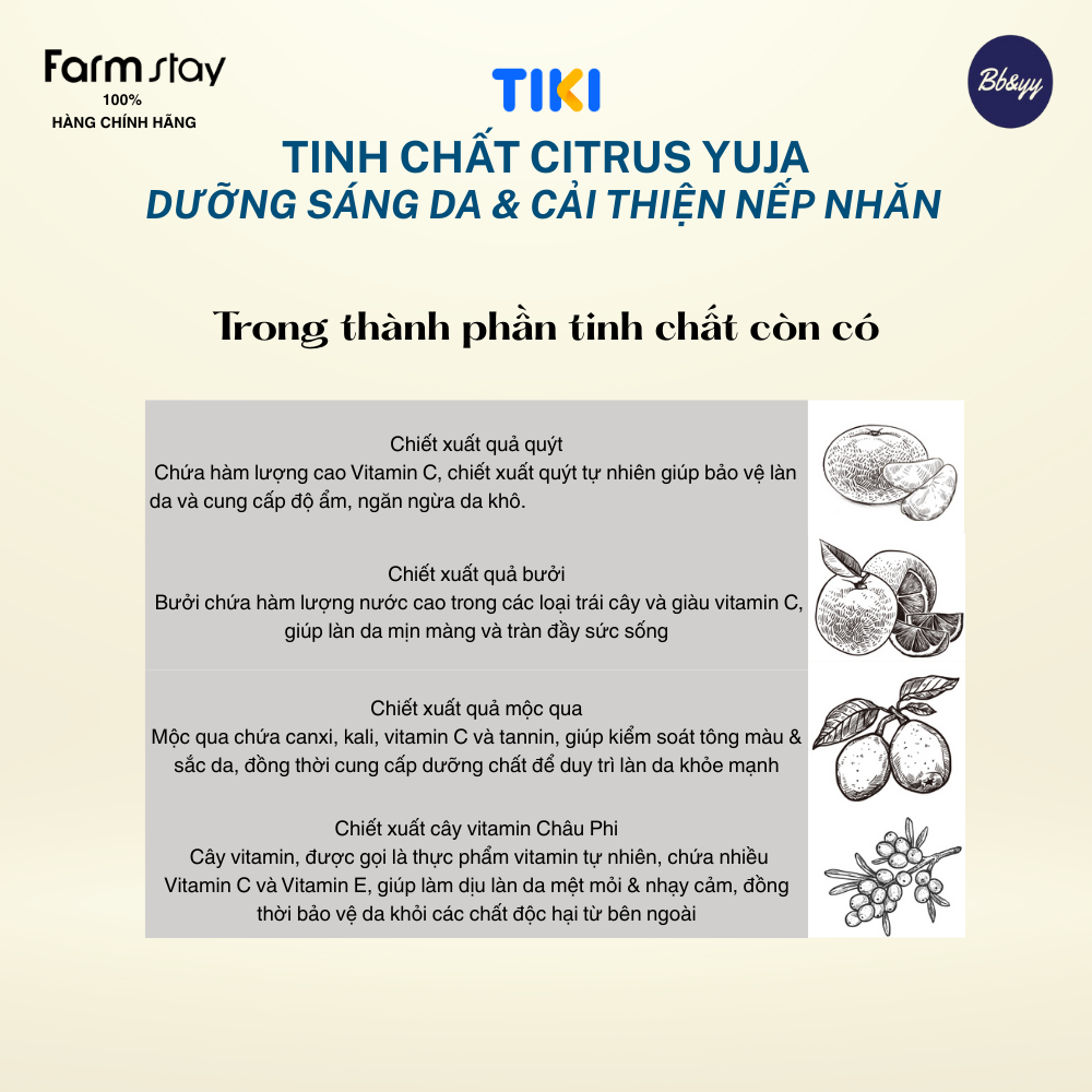 CÔNG DỤNG: Siêu tinh chất Citrus Yuja có chứa hàm lượng Vitamin C gấp 3 lần chanh từ quả yuja vàng vì vậy sản phẩm có các công dụng cho da như sau: