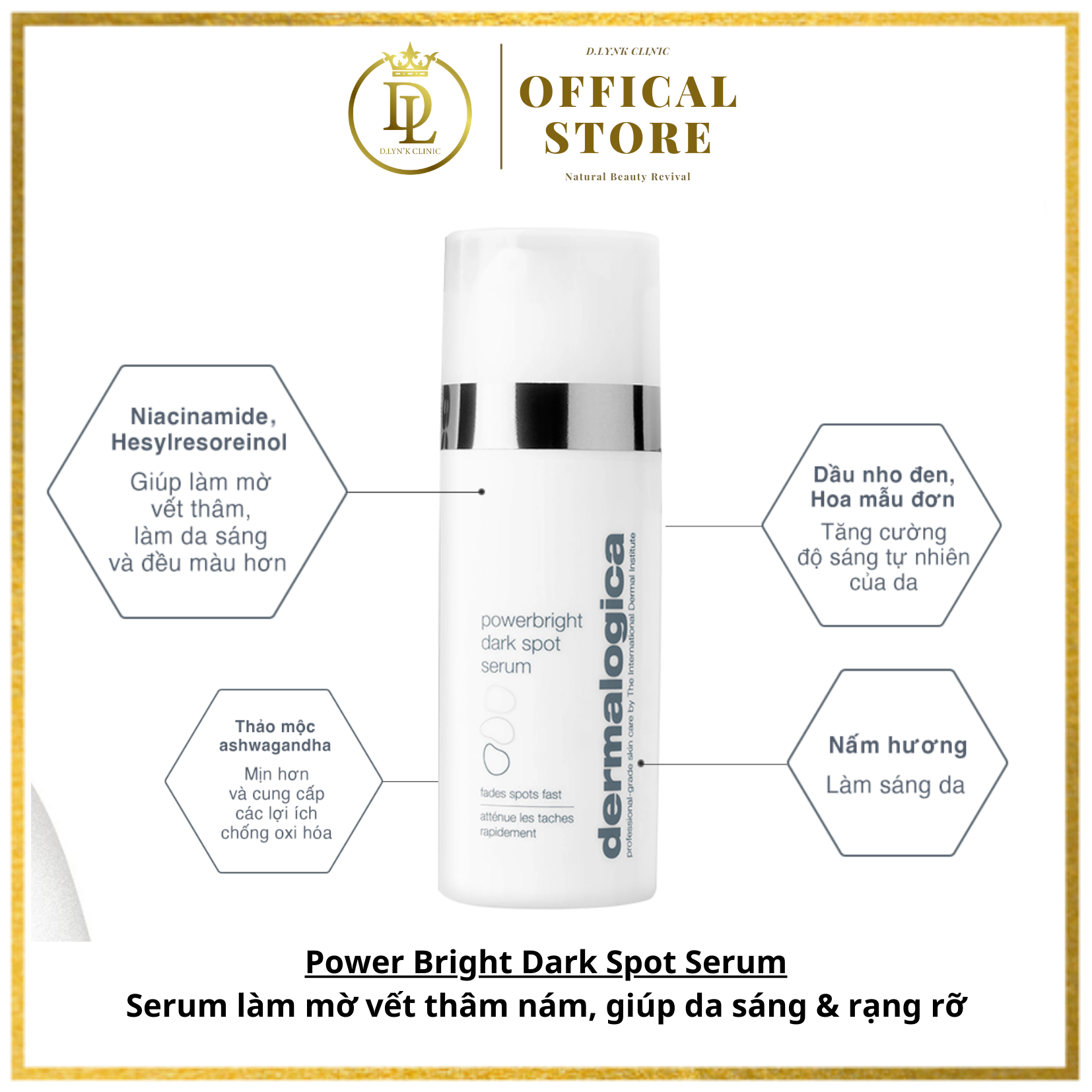 Công dụng: - Dưỡng da trắng sáng, căng mịn, đều màu - Cải thiện da tăng sắc tố, sạm và nám, hiệu quả từ 6 tuần - Mờ vết thâm do mụn, hiệu quả từ