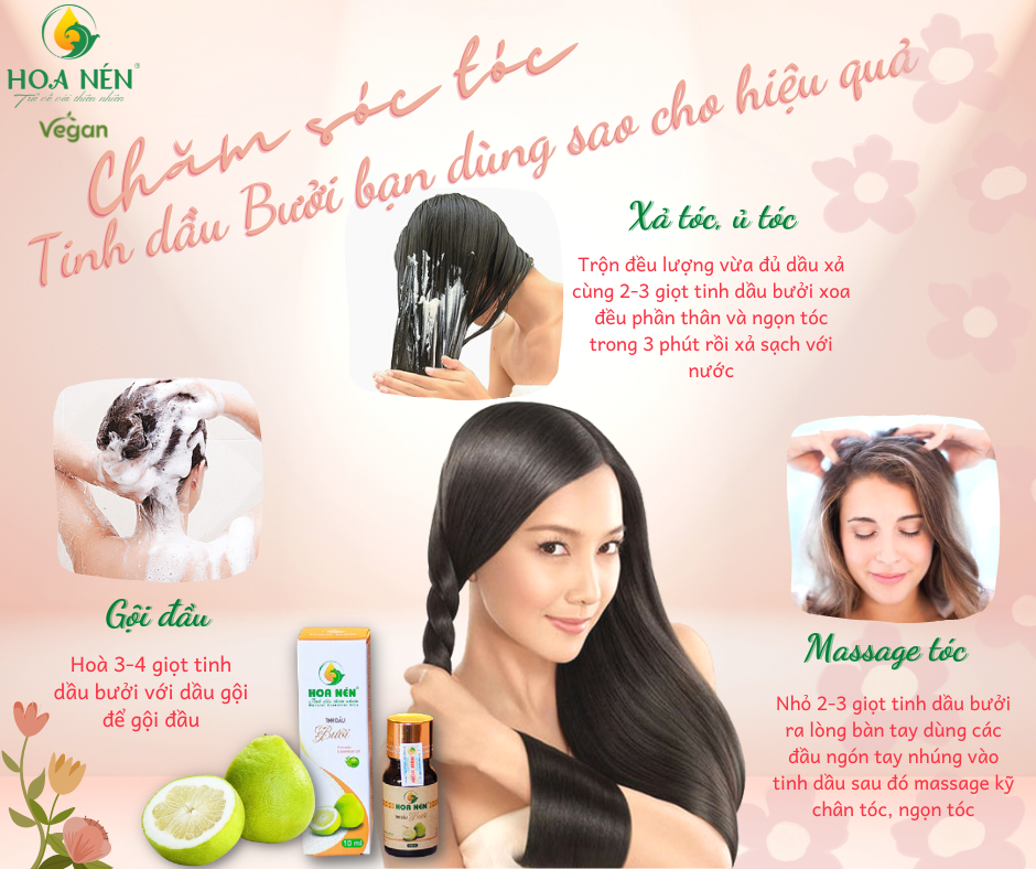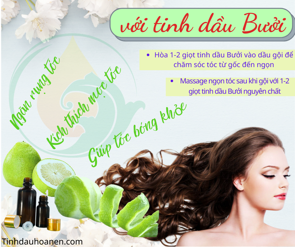 - Làm đẹp tóc: +Cách 1: Nhỏ vài giọt tinh dầu bưởi vào dầu gội để gội đầu, có thể pha với dầu dân (dầu dừa,O) sau đó xoa đều lên tóc sau 30 phút gọi bằng dầu gội như bình thường. + Cách 2: Sau khi gội đầu sạch sẽ bằng dầu gội, hòa vài giọt tinh dầu với nước ấm sau đó xoa đều lên vùng chân tóc và toàn mái tóc (không cần xả lại với nước). Nên kết hợp với tinh dầu sả, tinh dầu hương nhu để có hiệu quả tốt nhất. Lưu ý: