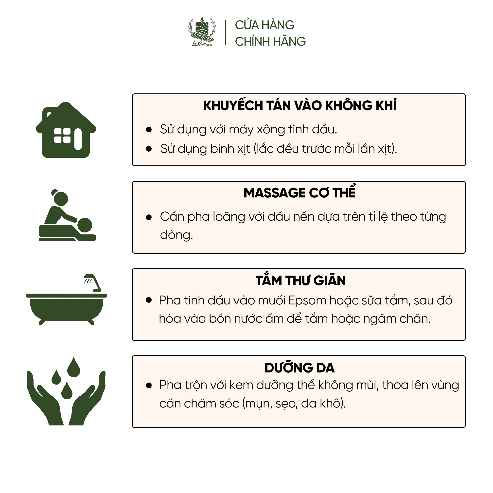 ► HƯỚNG DẪN SỬ : Khuếch tán vào không khí bằng cách sử dụng 1-2 giọt tinh dầu cho mỗi 100ml nước hoặc sử dụng trong bình xịt. Nếu sử dụng bình xịt, cần lắc đều trước mỗi lần xịt. Khi sử dụng trên da, cần pha loãng với nồng độ tối đa 3% (tương đương 3 giọt trên 5ml dầu nền - ứng với quy đổi 20 giọt bằng 1ml).