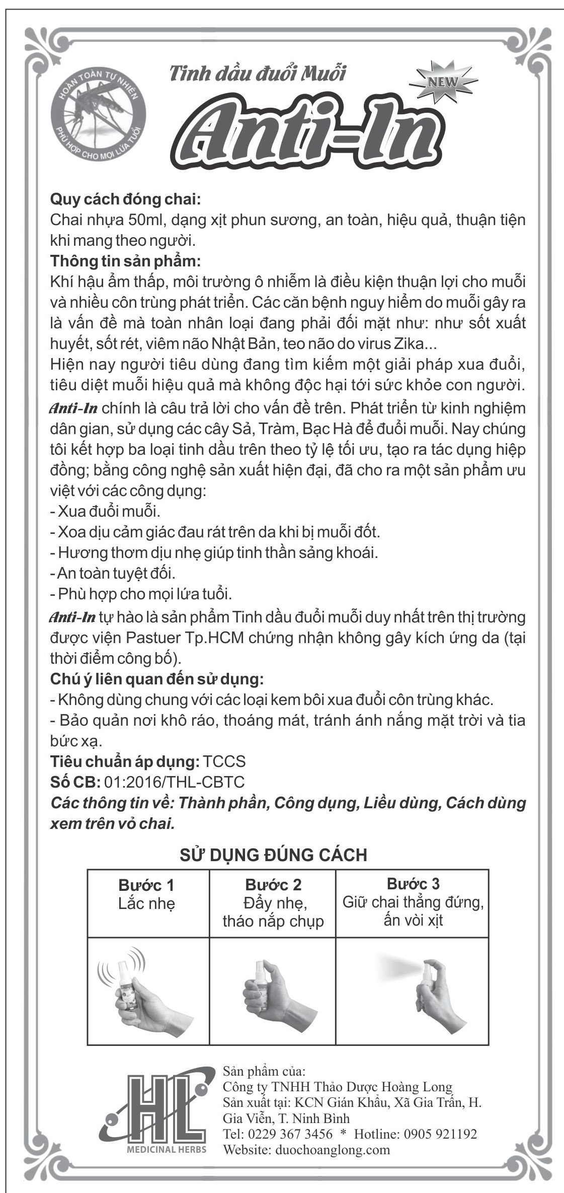 - Hỗ trợ điều trị côn trùng trích/đốt: Xịt lên lòng bàn tay, xoa đều quanh vết đốt sẽ hết sưng ngứa Thông Tin Sản Phẩm: Khí hậu ẩm thấp, môi trường ô nhiễm là điều kiện thuận lợi cho muỗi phát triển. Không chỉ gây bùng phát dịch bệnh virus Zika, muỗi còn là nguyên nhân lây lan hàng loạt căn bệnh nguy hiểm như sốt xuất huyết, sốt rét hay viêm não Nhật Bản…hàng năm lấy đi tính mạng hàng triệu người trên thế giới Hiện thị trường có nhiều sản phẩm phòng chống muỗi với những cách thức sử dụng khác nhau như: nhang đuổi muỗi, kem bôi, đèn diệt muỗi do Trung Quốc sản xuất…. Tuy nhiên, các loại sản phẩm này thường được làm bằng hóa chất nên khi sử dụng sẽ ảnh hưởng không tốt tới sức khỏe Người tiêu dùng đang tìm kiếm một giải pháp xua đuổi, tiêu diệt muỗi hiệu quả mà không độc hại tới sức khỏe con người. Và Anti-In chính là câu trả lời cho vấn đề trên. Kế thừa bài thuốc dân gian dùng cây sả, tràm, bạc hà để đuổi muỗi, bằng công nghệ chưng cất và tách chiết thủy phân tinh dầu trên dây truyền máy móc hiện đại, chúng tôi đã tạo ra một sản phẩm ưu việt với các công dụng: