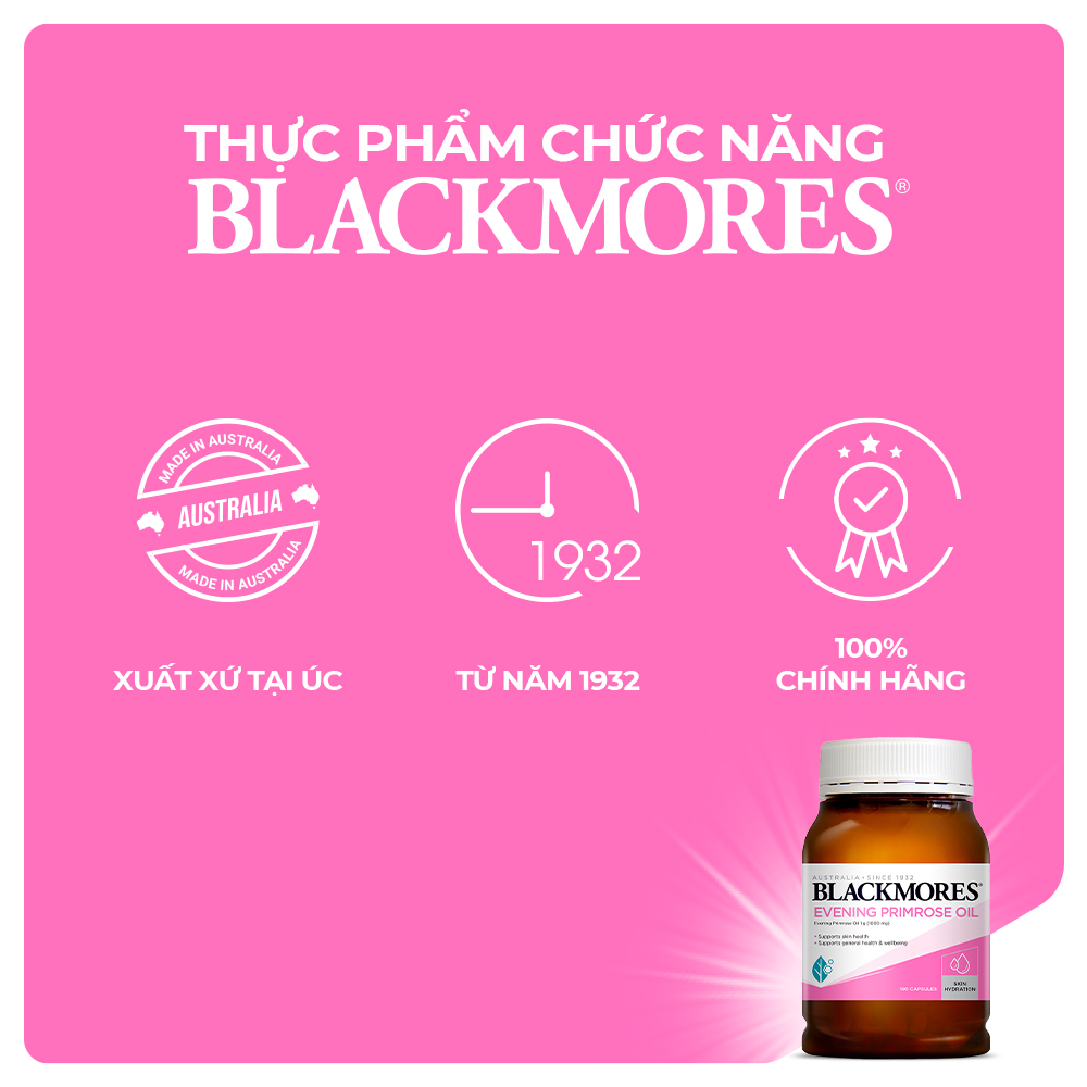Blackmores Evening Primrose Oil với thành phần chính là tinh dầu hoa anh thảo giúp cân bằng nội tiết tố cho phụ nữ trong thời kỳ kinh nguyệt, tiền mãn kinh và mãn kinh. Đồng thời, giúp làm đẹp da – tóc, cải thiện tình trạng huyết áp cao, phòng ngừa các bệnh về tim mạch, ngăn ngừa viêm khớp. Viên uống còn có hỗ trợ tăng cường sức khỏe sinh sản và sinh lý cho phái nữ. THÔNG TIN CHI TIẾT Thành phần: Mỗi viên Blackmores Evening Primrose Oil Omega chứa: • Evening Primrose oil (EPO) 1g (1000mg) Providing: gamma-Linolenic acid (GLA) 100mg.   Công dụng: • Cân bằng nội tiết tố, hỗ trợ giảm các triệu chứng khó chịu trong thời kỳ tiền kinh nguyệt như: đầy hơi, đau ngực, và các cảm giác khó chịu, thay đổi tâm trạng và lo lắng cho phụ nữ. Và hỗ trợ phụ nữ tiền mãn kinh và mãn kinh.  • Kích thích collage giúp da tăng độ đàn hồi, săn chắc da, cải thiện nếp nhăn sau 12 tuần. Đồng thời, bổ sung dưỡng chất cho mái tóc mềm mại, bóng mượt, ngăn tình trạng rụng tóc, hỗ trợ giảm khô môi và móng khỏe hơn.  • Hỗ trợ giảm mụn trứng cá và cải thiện tình trạng mụn đáng kể trong vòng 8 tuần sử dụng. • Cải thiện tình trạng huyết áp cao và cholesterol cao, phòng ngừa các bệnh về tim mạch.  • Ngăn ngừa viêm khớp, cải thiện các chứng thấp khớp. • Phòng chống tiểu đường: Hỗ trợ giảm lượng Insulin và chuyển hóa chất béo dễ dàng.  • Sản phẩm không chứa men, Gluten, lúa mì, các dẫn xuất sữa, chất bảo quản, màu sắc nhân tạo, hương vị hay chất tạo ngọt.  • Viên dạng nang mềm, dễ dàng hấp thụ nhanh vào cơ thể và dễ sử dụng.   Hướng dẫn sử dụng: • Người lớn: 2 – 4 viên/lần/ngày trong bữa ăn. + Hỗ trợ cho sức khỏe: 2 viên/ngày trong bữa ăn. + Hỗ trợ cho da và chống viêm da, mụn: 4 viên/ngày, 2 viên/lần trong bữa ăn. • Trẻ em dưới 18 tuổi - chỉ sử dụng theo chỉ định chuyên môn.   Lưu ý: • Phụ nữ có thai và cho con bú cần tham khảo ý kiến bác sĩ. • Không dùng cho người mẫn cảm với bất kỳ thành phần nào của sản phẩm. • Nếu bạn đang uống thuốc đặc biệt khác, không nên uống nếu không có sự cho phép của bác sĩ.   Hướng dẫn bảo quản: • Nơi khô ráo, thoáng mát. • Tránh ánh nắng trực tiếp, nơi có nhiệt độ cao hoặc ẩm ướt. • Đậy nắp kín sau khi sử dụng.   Xuất xứ: Úc Nơi sản xuất: Úc Ngày sản xuất: Xem trên bao bì sản phẩm Hạn sử dụng: 24 tháng kể từ ngày sản xuất Quy cách đóng gói: Lọ 190 viên   THÔNG TIN THƯƠNG HIỆU: Blackmores là công ty dẫn đầu trong lĩnh vực chăm sóc sức khoẻ từ thiên nhiên của Úc được thành lập vào năm 1930. Dựa trên tầm nhìn và niềm đam mê của ông Maurice Blackmore – người sáng lập thương hiệu – Blackmores luôn nỗ lực tạo ra những sản phẩm bảo vệ sức khỏe từ các loại thảo mộc tự nhiên. Không chỉ gây ấn tượng về bề dày lịch sử và sự phát triển ổn định của công ty, Blackmores còn nỗ lực tạo ra nhiều hơn giá trị cộng đồng như bảo vệ môi trường, hỗ trợ cho cộng đồng, thúc đẩy tư duy đầu tư để có một cơ thể khỏe mạnh. Đến nay, Blackmores vẫn không ngừng nghiên cứu, tìm tòi để phát triển các sản phẩm mới nhằm mang đến sự chăm sóc tốt hơn cho sức khỏe khách hàng.