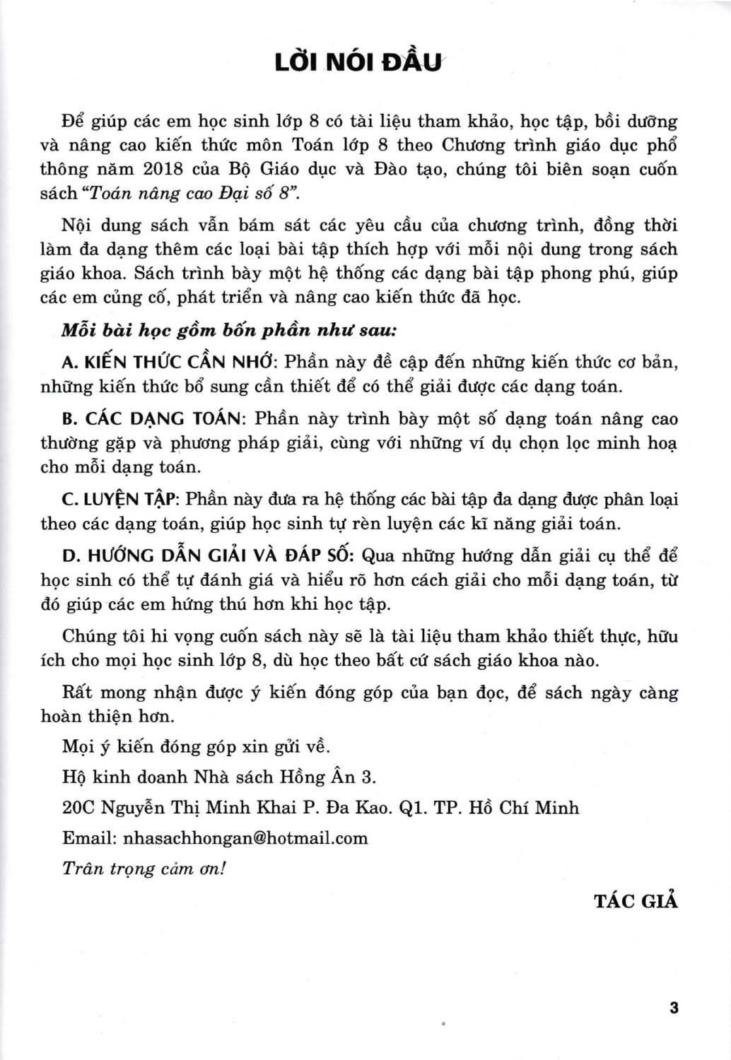 Để giúp các em học sinh lớp 8 có tài liệu tham khảo, học tập, bồi dưỡng và nâng cao kiến thức môn Toán lớp 8 theo Chương trình giáo dục phổ thông năm 2018 của Bộ Giáo dục và Đào tạo, chúng tôi biên soạn cuốn sách Toán Nâng Cao Đại Số 8.
