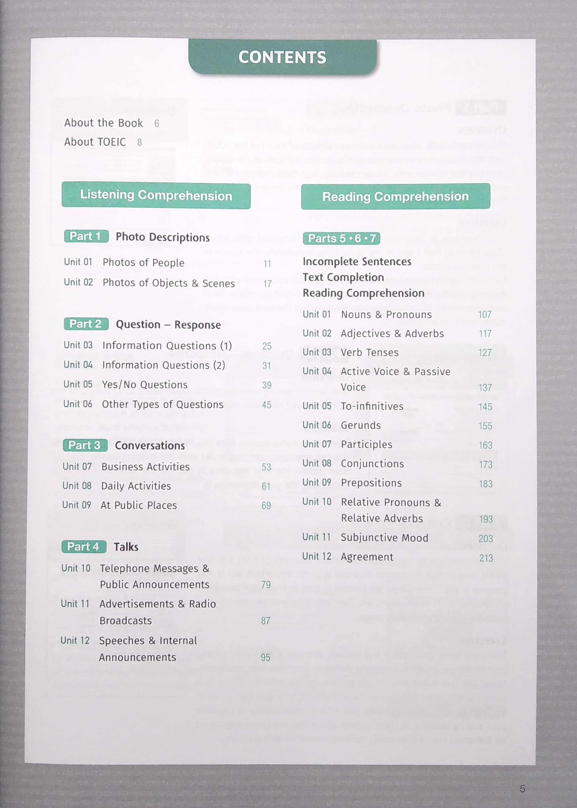 Chapter 01: Listening Comprehension - Part 1: Strategies - Part 2: Strategies - Part 3, 4: General Strategies - Part 3: Strategies - Part 4: Strategies Chapter 02: Reading Comprehension - Unit 01: Structural Understanding