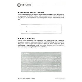Presumably, exam preparation for an internationally recognized certificate is a vital period. You will find it less stressful if you have relevant and beneficial materials in hand. TOEIC SMART series is, hence, the right choice for you. Each set of the series consists of three separate books, and each book has eight lessons which respectively provide you with certain necessary input and a variety of exercises for practice. You will find easy-to-learn grammar lessons as well as typical formats and topics of listening and reading tests, all of which aim at improving the knowledge of grammar, the listening and reading comprehension skills usedin an international environment. Most significantly, every book goes with an MP3 CD which certainly helps you improve both your pronunciation and your listening ability. You should make good use of the CDs to effectively achieve these purposes after checking your work with the answer key.