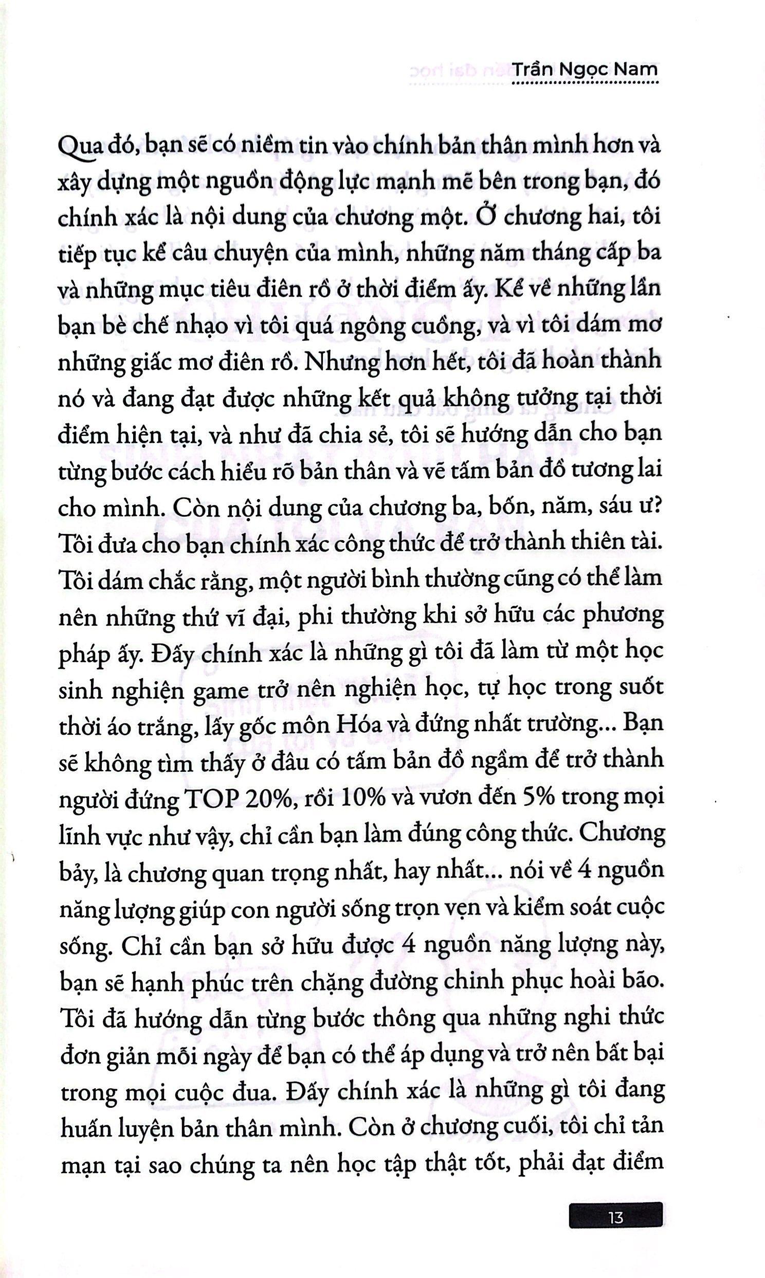 Còn nội dung của chương ba, bốn, năm, sáu ư? Tôi đưa cho bạn chính xác công thức để trở thành thiên tài. Tôi dám chắc rằng, một người bình thường cũng có thể làm nên những thứ vĩ đại, phi thường khi sở hữu các phương pháp ấy. Đấy chính xác là những gì tôi đã làm từ một học sinh nghiện game trở nên nghiện học, tự học trong suốt thời áo trắng, lấy gốc môn Hóa và đứng nhất trường… Bạn sẽ không tìm thấy ở đâu có tấm bản đồ ngầm để trở thành người đứng TOP 20%, rồi 10% và vươn đến 5% trong mọi lĩnh vực như vậy, chỉ cần bạn làm đúng công thức.