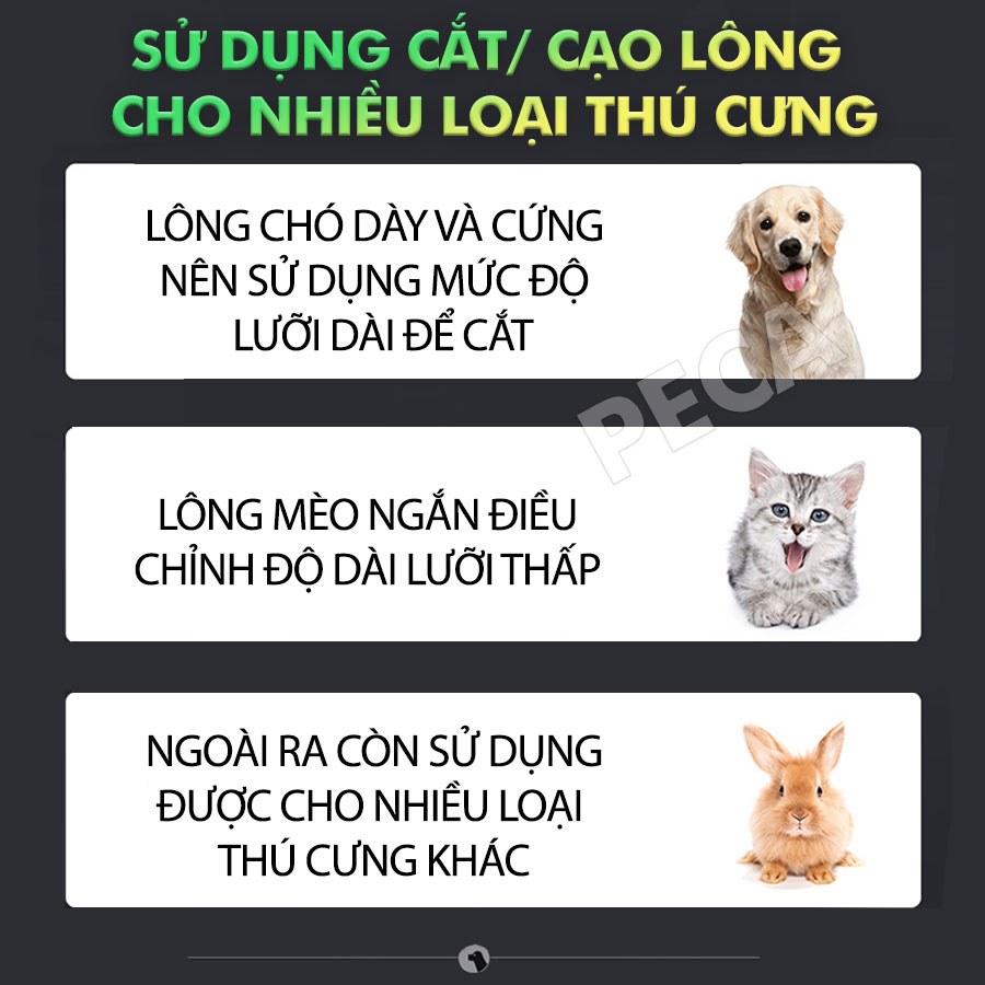 Kèm theo máy là bộ 6 cữ kết hợp với điều chỉnh độ dài lưỡi giúp bạn cắt được cho nhiều dòng thú cưng
