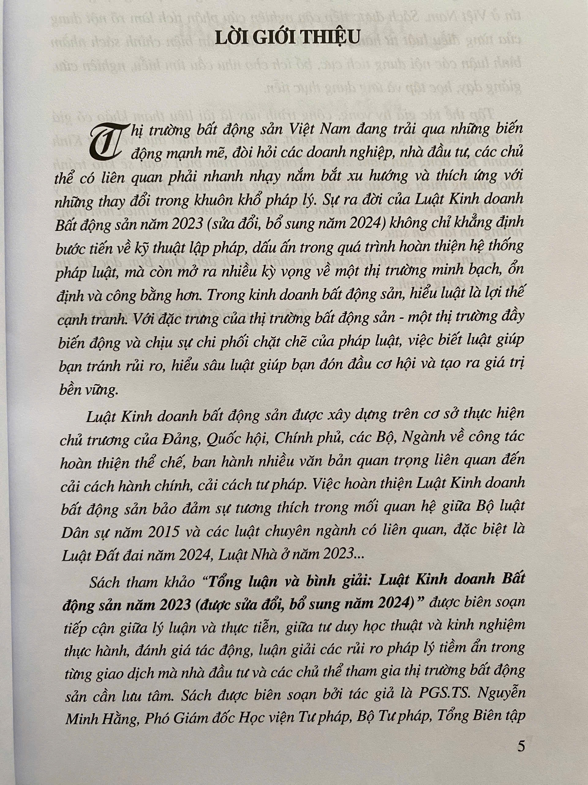 Sách tham khảo “Tổng luận và bình giải: Luật Kinh doanh Bất động sản năm 2023 (được sửa đổi, bổ sung năm 2024)” được biên soạn tiếp cận giữa lý luận và thực tiễn, giữa tư duy học thuật và kinh nghiệm thực hành, đánh giá tác động, luận giải các rủi ro pháp lý tiềm ẩn trong từng giao dịch mà nhà đầu tư và các chủ thể tham gia thị trường bất động sản cần lưu tâm. Sách được biên soạn bởi tác giả là PGS.TS. Nguyễn Minh Hằng, Phó Giám đốc Học viện Tư pháp, Bộ Tư pháp, Tổng Biên tập Tạp chí Nghề luật và ThS. NCS Trần Chí Thành, giảng viên Trường Đại học Luật, Đại học Huế là hai chuyên gia pháp luật đến từ hai môi trường đào tạo, nghiên cứu khoa học pháp lý, thực hành nghề luật ứng dụng có uy tín ở Việt Nam. Sách được tiếp cận nghiên cứu phân tích làm rõ nội dung của từng điều luật từ hàn lâm, thực tiễn đến phản biện chính sách nhằm bình luận các nội dung tích cực, bổ ích cho nhu cầu tìm hiểu, nghiên cứu, giảng dạy, học tập và ứng dụng thực tiễn.