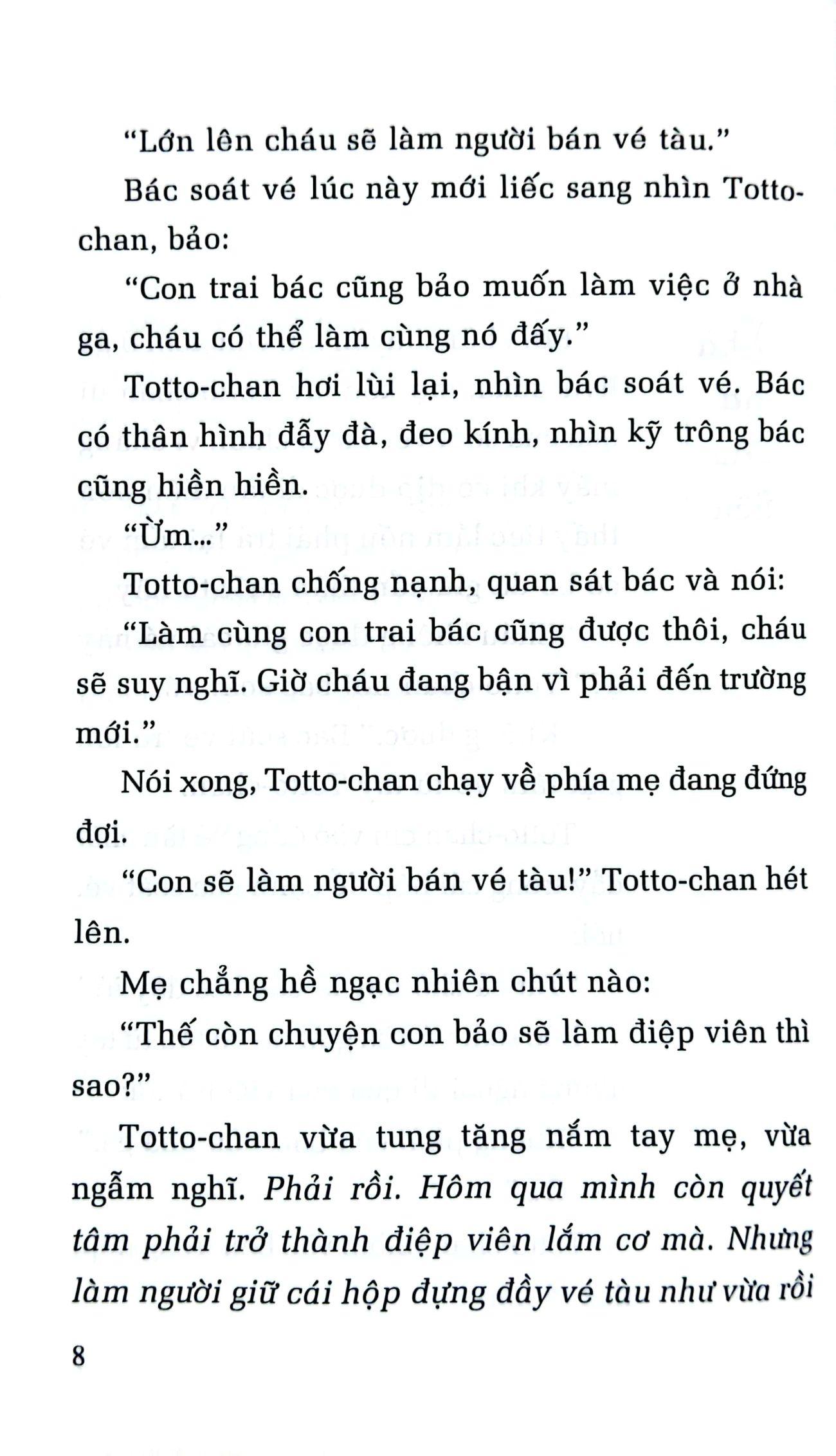 Không còn cách nào khác, mẹ đành đưa Totto-chan đến một ngôi trường mới, trường Tomoe. Đấy là một ngôi trường kỳ lạ, lớp học thì ở trong toa xe điện cũ, học sinh thì được thoả thích thay đổi chỗ ngồi mỗi ngày, muốn học môn nào trước cũng được, chẳng những thế, khi đã học hết bài, các bạn còn được cô giáo cho đi dạo. Đặc biệt hơn ở đó còn có một thầy hiệu trưởng có thể chăm chú lắng nghe Totto-chan kể chuyện suốt bốn tiếng đồng hồ! Chính nhờ ngôi trường đó, một Totto-chan hiếu động, cá biệt đã thu nhận được những điều vô cùng quý giá để lớn lên thành một con người hoàn thiện, mạnh mẽ.