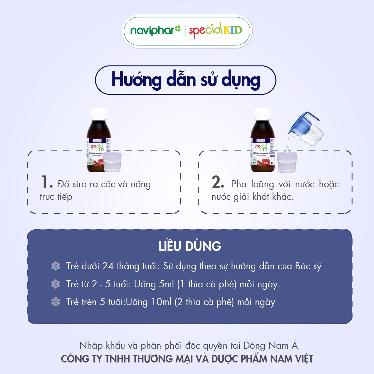 Siro hỗ trợ phát triển chiều cao, giúp phát triển hệ xương và răng ở trẻ em, chống còi xương, giúp trẻ đang lớn phát triển chiều cao Canxi và Vitamin D / Calcium Vitamine D TPBVSK Special Kid Calcium Vitamine D / Special Kid Calcium Vitamin D 125ml [Nhập khẩu - Pháp] Special Kid là thương hiệu nhập khẩu nguyên hộp từ Pháp, đáp ứng hầu hết nhu cầu phòng và hỗ trợ điều trị các bệnh thường gặp của trẻ trong những năm tháng đầu đời. Special Kid Calcium Vitamin D được bào chế chuyên biệt dành cho trẻ em, mùi vị dễ chịu, chỉ cần sử dụng 1 lần/ngày. Tiết kiệm. Dễ nhớ Công dụng : Bổ sung Calcium và Vitamin D giúp xương , răng chắc khỏe. Hỗ trợ phát triển chiều cao ở trẻ nhỏ. Đối tượng sử dụng : Trẻ em còi xương Trẻ em trong giai đoạn phát triển chiều cao Trẻ em cần bổ sung Calcium do chế độ ăn thiếu Hướng dẫn sử dụng : Trẻ em dưới 24 tháng tuổi : Sử dụng theo hướng dẫn của Bác sỹ. Trẻ dưới 5 tuổi : Uống 5ml (1 thìa cà phê) mỗi ngày vào buổi sáng. Trẻ trên 5 tuổi : Uống 10ml (2 thìa cà phê) mỗi ngày vào buổi sáng. Lắc kỹ trước khi dùng. Có thể uống trực tiếp hoặc pha loãng với nước hay nước giải khát khác. Giá trên đã bao gồm thuế giá trị gia tăng theo luật định. Sản phẩm không phải thuốc, không có tác dụng thay thế thuốc chữa bệnh. Thông tin sản phẩm : Đóng gói : Chai / Hộp Mùi hương : Vị ngọt Hương dâu tây Dung tích : Chai 125ml Xuất xứ : Pháp Thành phần : Thành phần chính cho 1 liều 10ml: Calcium ... 120 mg Vitamin D ... 5 mcg Vitamin B12 ... 2 mcg Nhập khẩu & phân phối : Công ty TNHH TM và DP Nam Việt