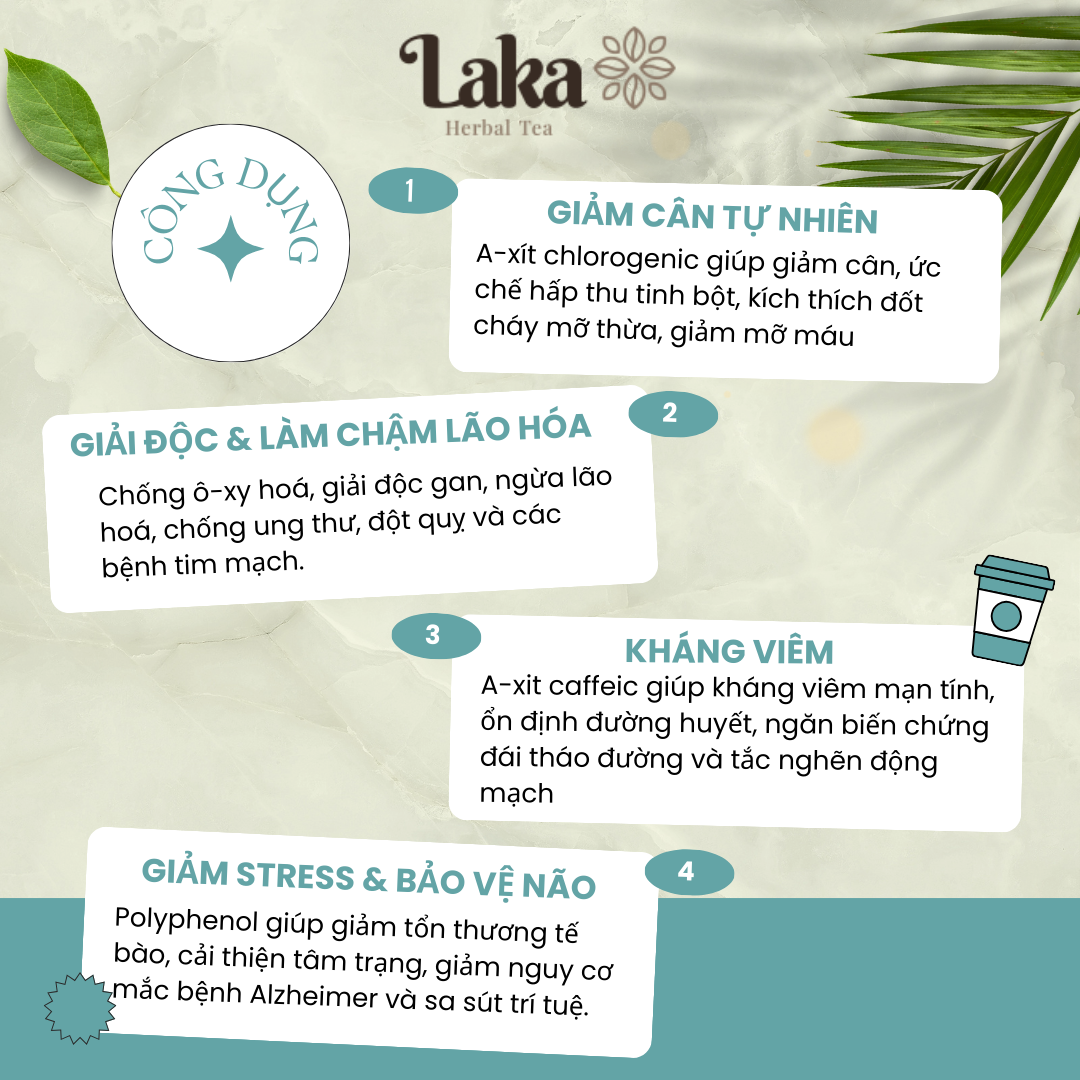 Thông tin chung :THƯƠNG HIỆU: LAKA TEATÊN SẢN PHẨM: Trà Cà Phê Túi Lọc Cascara LAKA XUẤT XỨ: Việt NamSỐ LƯỢNG và QUY CÁCH: Hộp 20 túi x 4gDÀNH CHO: Người lớn từ 18 tuổi trở lên(Sản phẩm không phải là ...