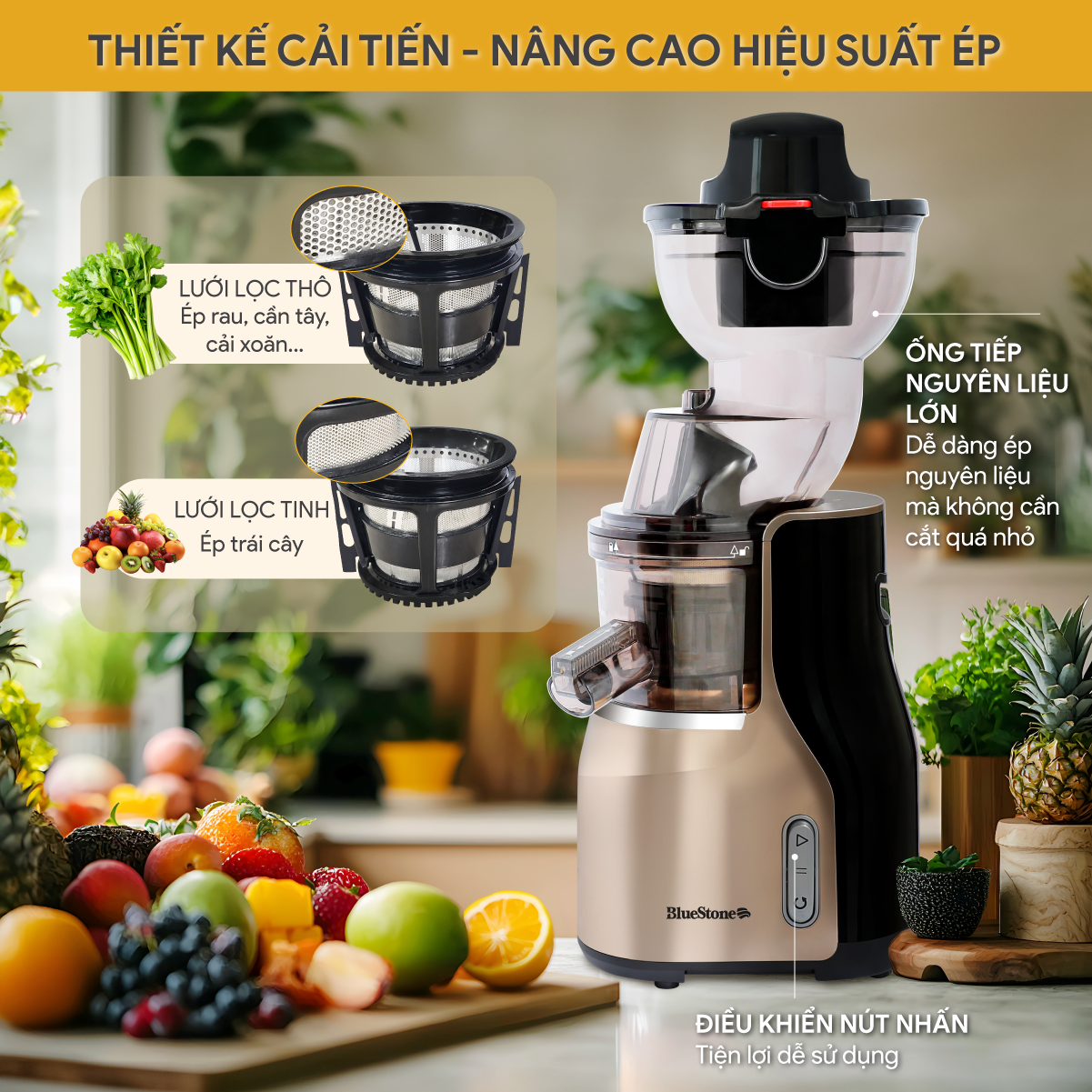 Ép với tốc độ chậm 35-45 vòng/phút, tối đa khả năng chiết xuất, bảo toàn các vitamin và dưỡng chất.