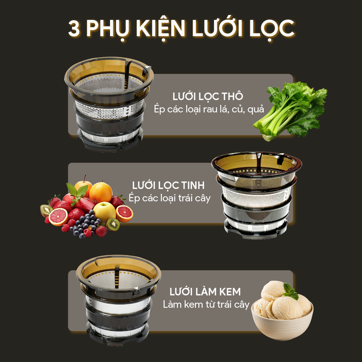 Đa chức năng với 3 loại lưới lọc, phù hợp với nhiều loại thực phẩm.