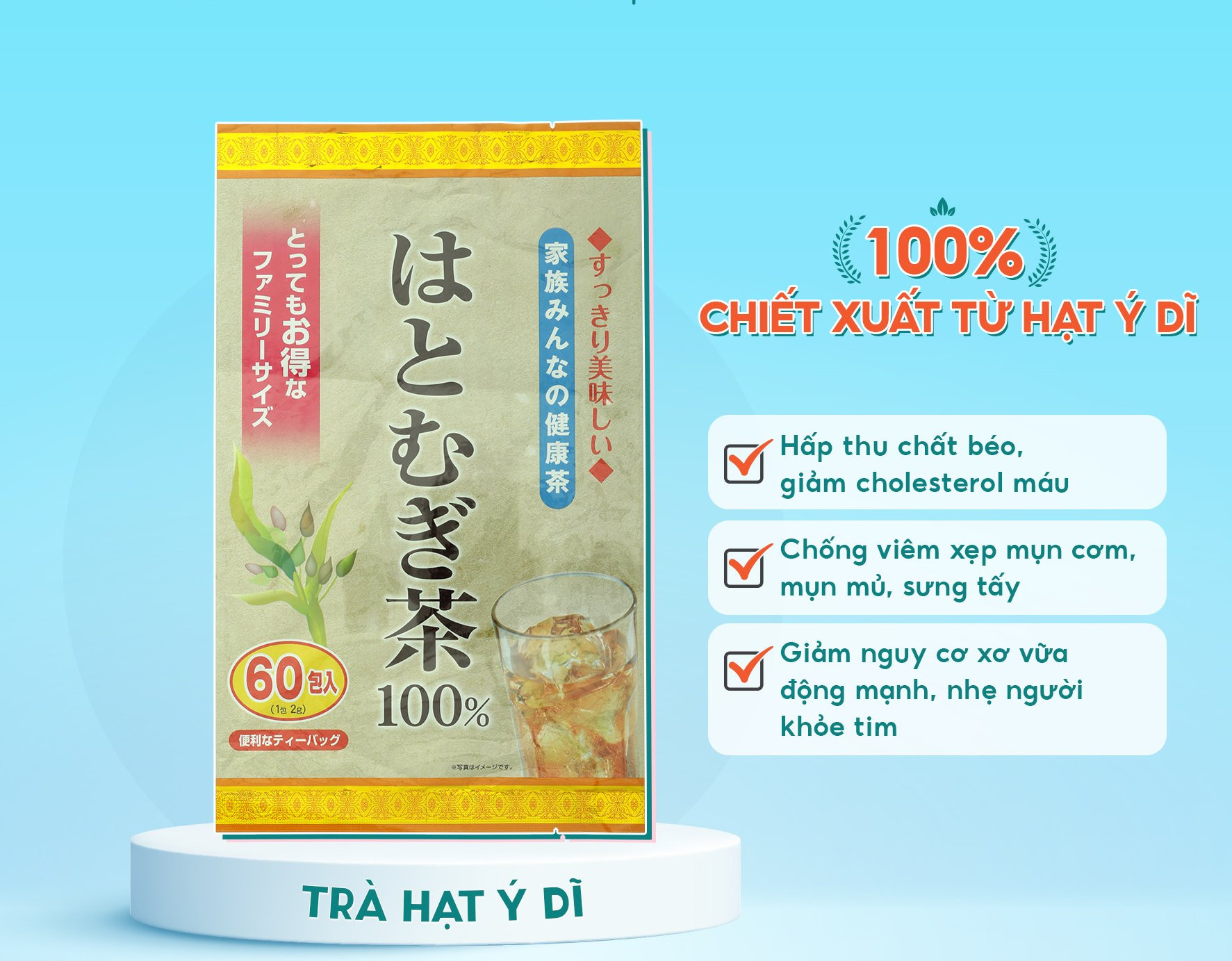 - Có thể uống với đá tạo cảm giác thánh mát cơ thể tức thì THÀNH PHẦN: 100% Hạt Ý dĩ Đóng gói: 2 g/túi lọc x 60 túi lọc Hướng dẫn sử dụng: Cách 1: Hãm trực tiếp: Cho một gói trà vào ấm/cốc, sau đó rót nước nóng già vào, đậy nắp ấm/cốc, hãm trà trong vòng 2-3 phút rồi thưởng thức. Cách 2: Đun sôi trà: Khi nước sôi thì thả 1-2 gói trà vào, đun tiếp trong khoảng 2-3 phút để trà có độ đậm đặc tùy theo sở thích. Đôi khi có thể quan sát thấy một lớp dầu mỏng trên bề mặt nước trà do thành phần chất béo trong hạt Ý dĩ. Do vậy, hiện tượng này là tự nhiên, không ảnh hưởng đến chất lượng sản phẩm. Hướng dẫn bảo quản: Bảo quản ở nhiệt độ thường. Sau khi mở túi sản phẩm, nên bảo quản các túi trà lọc trong hộp có nắp đậy kín hoặc túi zip. Tránh để sản phẩm tiếp xúc trực tiếp với ánh nắng mặt trời hoặc nơi có nhiệt độ, độ ẩm cao. Lưu ý: Sử dụng sản phẩm trong thời gian ngắn nhất sau khi mở túi. Đôi khi nguyên liệu có thể bám vào bề mặt túi trà gây nên các vết bẩn. Trường hợp này không gây ảnh hưởng gì đến chất lượng sản phẩm. Không sử dụng sản phẩm khi đã hết hạn sử dụng.