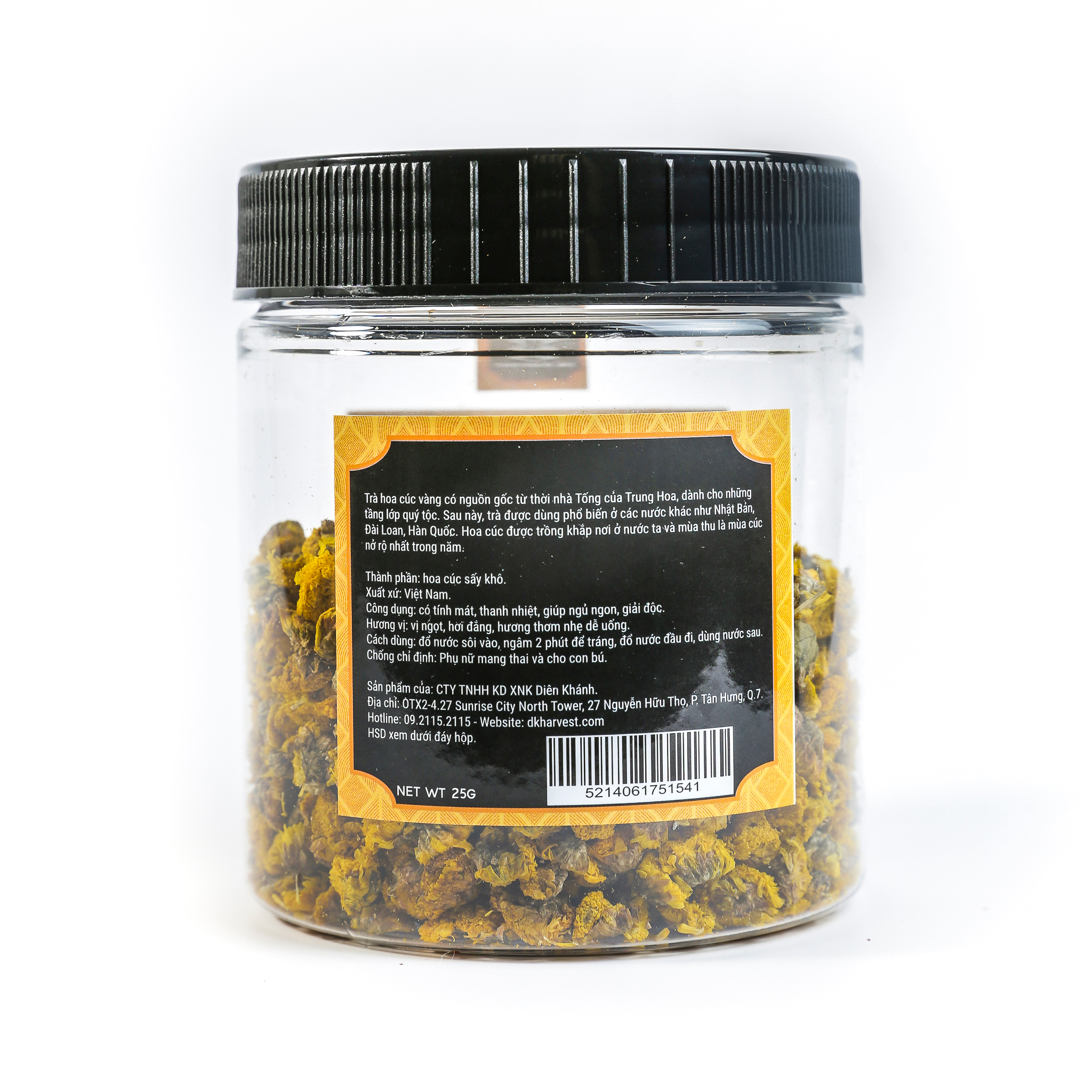 Mua tại TiktokTrà Hoa Cúc Vàng Sấy Khô Nguyên Bông DK Harvest Hoa cúc là cái tên quen thuộc mà ai cũng biết, được biết đến như một loại hoa để trang trí rất phổ biến nhưng ít ai biết được những công dụng khác của hoa cúc khô với sức khỏe. Trà hoa cúc sấy khô nguyên bông là một loại trà thảo mộc có nguồn gốc hoàn toàn từ thiên nhiên được làm từ chính những bông hoa cúc đẹp nhất, tốt nhất. Trà có tính mát, giúp thanh nhiệt và giải độc cho cơ thể rất hiệu quả, là loại trà rất phù hợp với những người bị thiếu ngủ, khó ngủ. Trà hoa cúc vàng DK Harvest Thành phần của trà hoa cúc