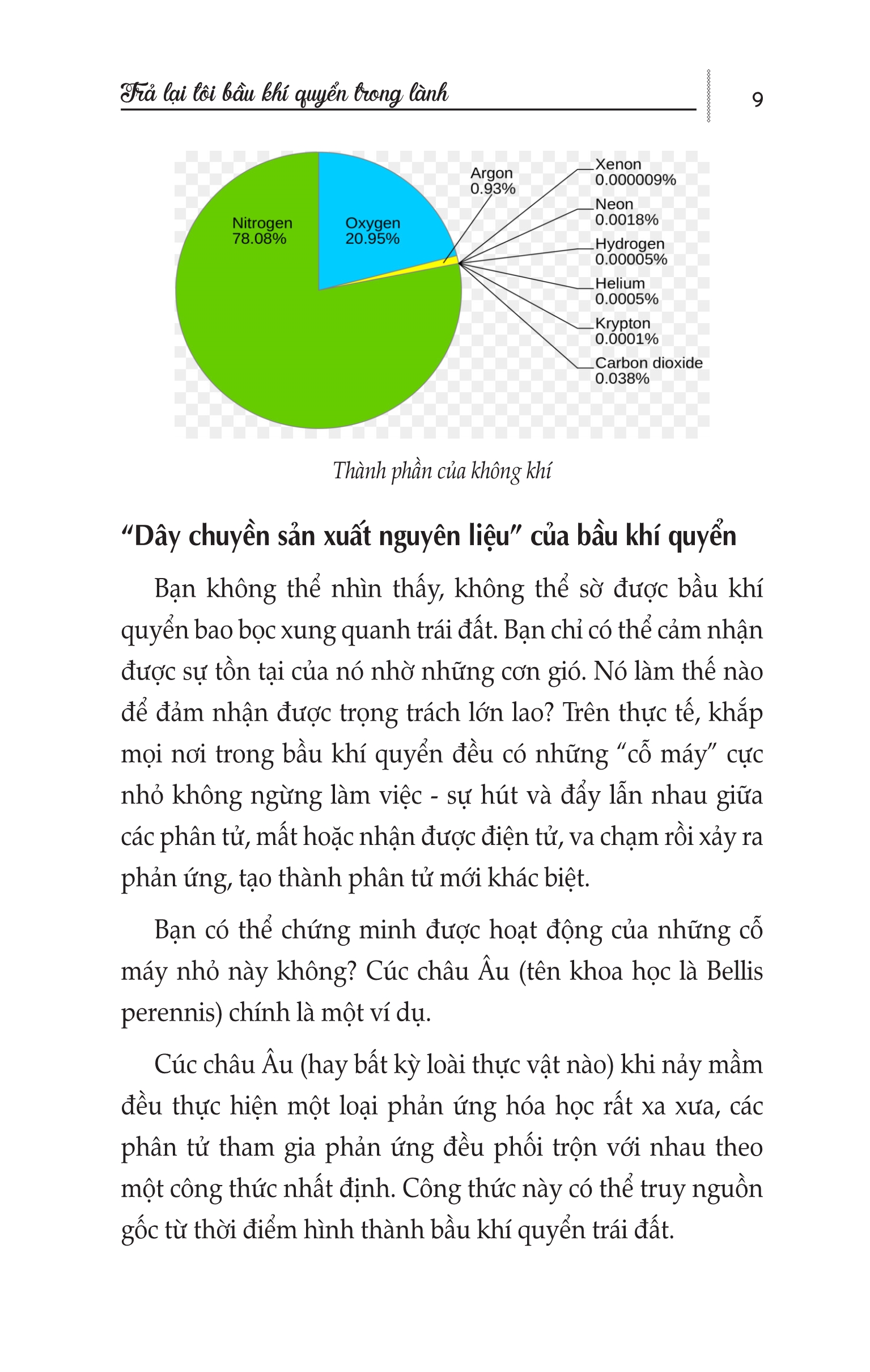 Khi tìm kiếm một hành tinh khác để di cư, vấn đề đầu tiên cần khảo sát là khí quyển của hành tinh đó. Cần xem tầng khí quyển của hành tinh đó liệu có độ ẩm thích hợp hay không, trong khí quyển có chất khí để con người có thể hô hấp hay không, “hệ thống cung cấp nhiệt” của lớp khí quyển không được quá nóng cũng không được quá lạnh, đồng thời cần phải phòng chống được tia bức xạ. Lớp khí quyển của trái đất không phải vừa sinh ra đã giống như ngày hôm nay. Trái đất được hình thành cách đây khoảng 4.5 tỷ năm. Cho đến mãi 2,4 tỷ năm trước, phân tử ô-xy tự do mới bắt đầu xuất hiện. Cách đây khoảng vài trăm triệu năm mới có lớp khí quyển 4 tầng như ngày nay, và cũng mới có loài người chúng ta.             Khí quyển không phải là không bị thay đổi. Nhưng khi bị ô nhiễm, thì nó sẽ bị biến đổi nhanh. Việc đốt than đá quá nhiều trong thời kỳ cách mạng công nghiệp khiến cho London trở thành thành phố sương mù. Khí thải xe ô tô và khí thải công nghiệp khiến cho Los Angeles bị sương mù quang hóa. Những chất gây ô nhiễm không khí trực tiếp gây ra sự đau khổ và chết chóc cho sinh vật trên trái đất.             Trong cuốn sách này, chúng ta cùng tìm hiểu các chất gây ô nhiễm khí quyển. Bạn sẽ phát hiện, việc xử lý rất nhiều các chất gây ô nhiễm đều là cuộc đấu tranh với lợi ích và thói quen của con người. Chẳng hạn, việc nghiêm cấm sử dụng xăng chứa chì gây tổn hại cho ngành công nghiệp hóa học, việc đưa ra các tiêu chuẩn nghiêm ngặt đối với khí thải xe hơi đã đe dọa ngành công nghiệp xe hơi. Thậm chí, hạn chế lái xe hơi và đốt than, đều ảnh hưởng đến thói quen sinh hoạt của con người. Bạn cũng hiểu được rằng, bây giờ có thể dùng phương pháp gì để làm sạch khí quyển. Mỗi một đồ vật mà chúng ta sử dụng đều có nguồn gốc, và có một nơi để đi về. Chúng ta không muốn rằng cuối cùng chúng sẽ biến thành vật gây ô nhiễm. Không khí trong lành là báu vật có giá trị nhất đối với loài người.