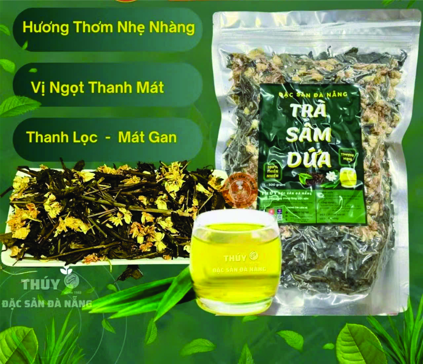 Trà sâm dứa Đà Nẵng chính gốc túi 500gr - HSD 12 tháng - thành phần :Búp trà xanh,Trà tiên , Lá dứa,Hương thảo mộc tự nhiên . Cách pha trà sâm dứa Đà Nẵng