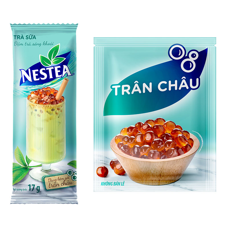 - Vị ngọt & béo nhẹ, phù hợp với thị hiếu thưởng thức trà sữa hiện đại. THÀNH PHẦN TRÀ SỮA NESTEA: Đường, bột kem (có chứa sữa - contain mik), sữa bột tách kem (6,5%) - skimmed milk powder, bột whey (cô chứa sữa - contain milk), chiết xuất trà xanh (3,5%), hương liệu giống tự nhiên, bột trà xanh (0,5%), muối i-ốt, chất tạo ngọt tổng hợp (acesulfam kali, sucralose). Sản phẩm có thể chứa gluten và đậu nành (may contain gluten and soya). Lưu ý: Không dùng cho người dị ứng với các thành phần của sản phẩm. TRÂN CHÂU: Nước, đường, chất ổn định (425, 407, 401, 1422, 508), chất điều chỉnh độ acid (327, 330), hương liệu tự nhiên và giống tự nhiên, đường caramel, chất bảo quản 202, chất tạo ngọt tổng hợp 950, đường đen. Lưu ý: Nhai kỹ trước khi nuốt. Trẻ em dưới 11 tuổi nên ăn dưới sự giám sát của người lớn. HƯỚNG DẪN SỬ DỤNG Cho 1 gói trà sữa Nestea vào 70 ml nước nóng, khuấy đều, thêm đá, cho gói trân châu và thưởng thức. HƯỚNG DẪN BẢO QUẢN Bảo quản sản phẩm nơi khô ráo và thoáng mát, tránh ánh nắng trực tiếp. LƯU Ý