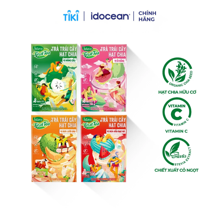 Trà trái cây hạt chia hòa tan Lúave (Vị Mãng cầu, Ổi hồng, Dưa lưới đào, Dưa hấu bạc hà)Trà trái cây hạt chia hòa tan Lúave (Vị Mãng cầu, Ổi hồng, Dưa lưới đào, Dưa hấu bạc hà)