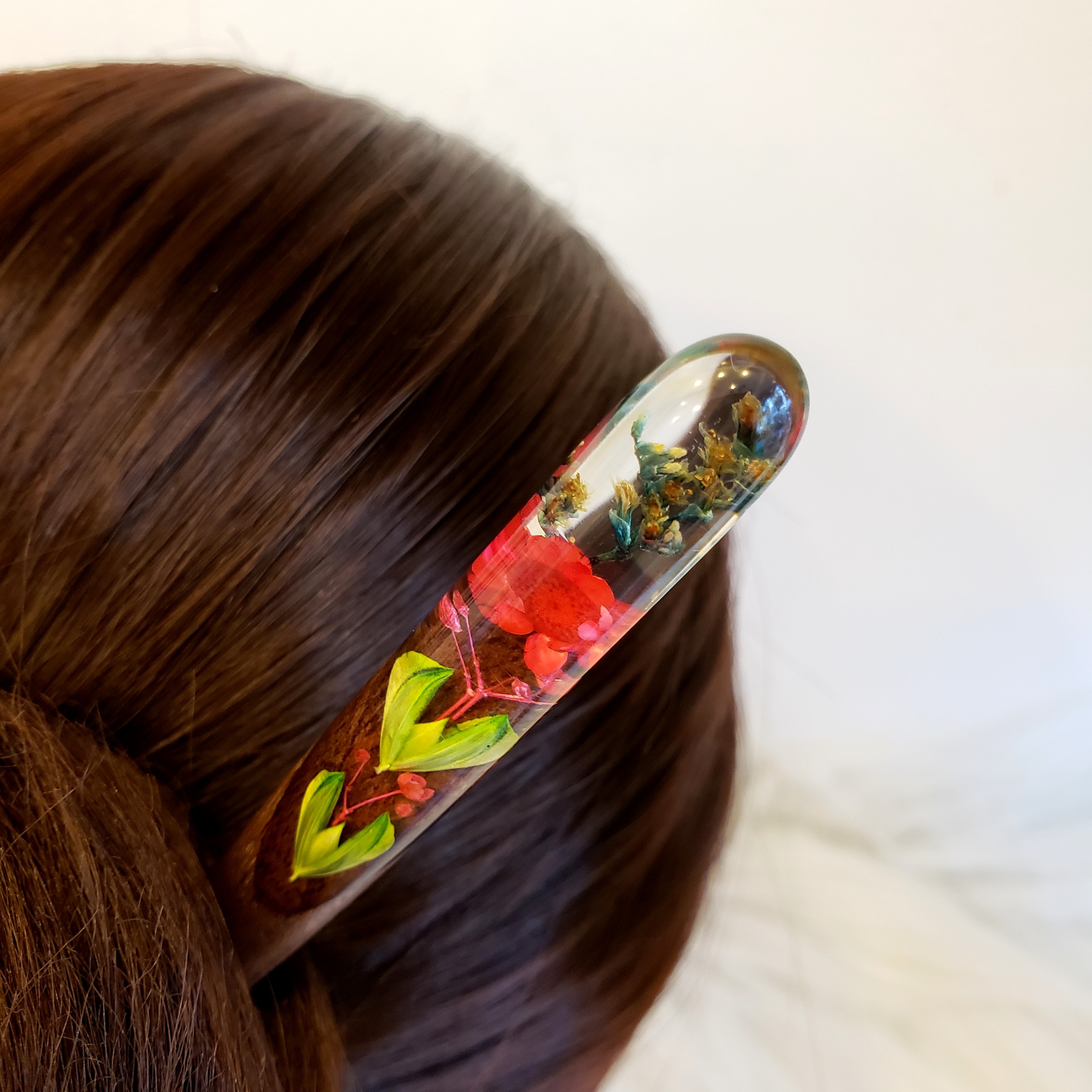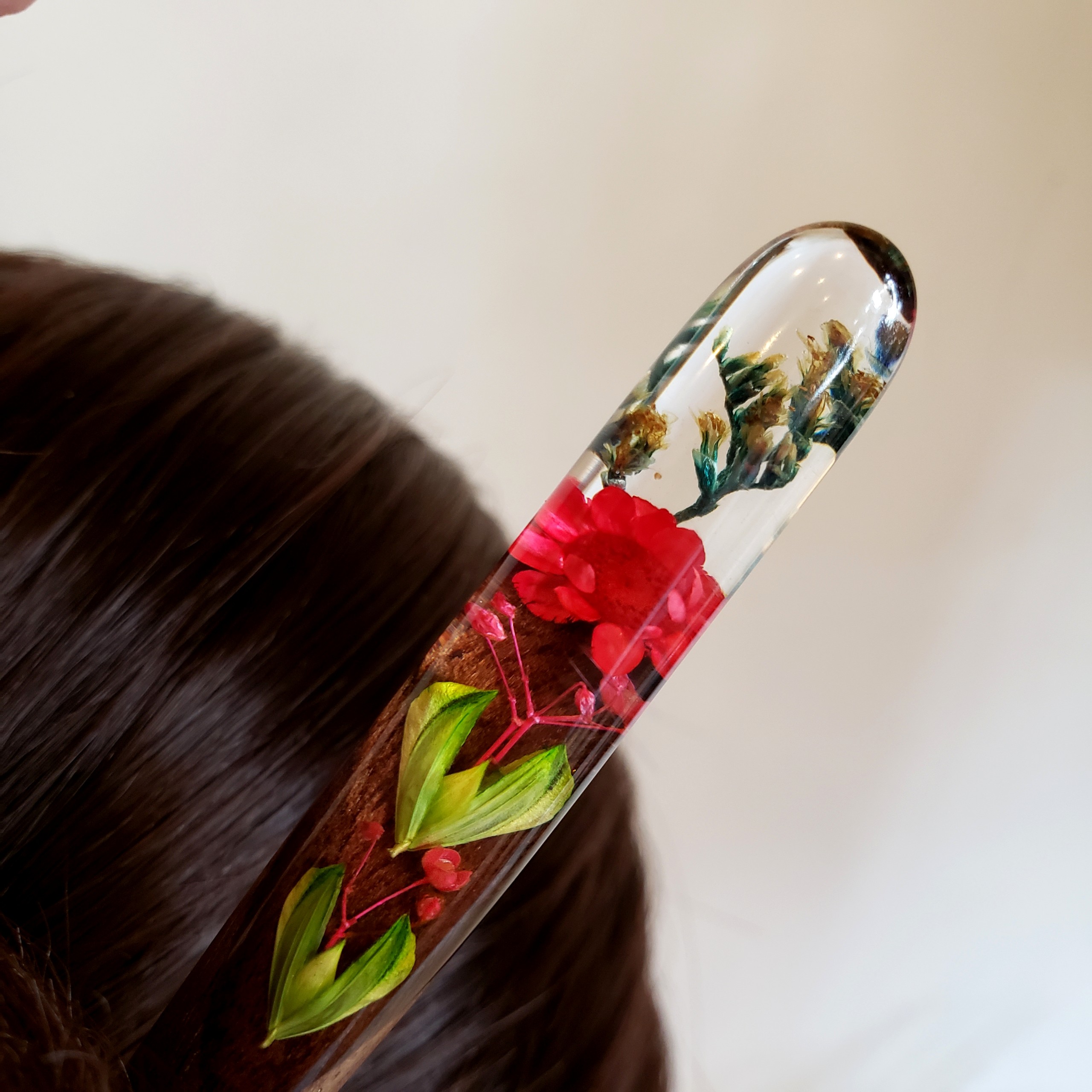 ✨Trâm cài tóc gỗ- resin & hoa snowy đỏ