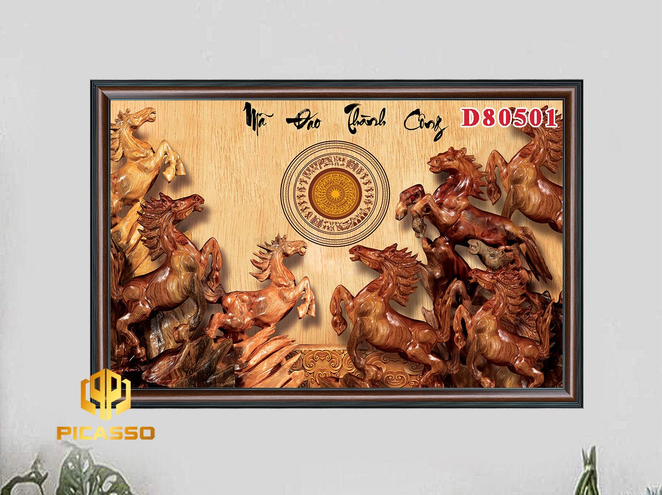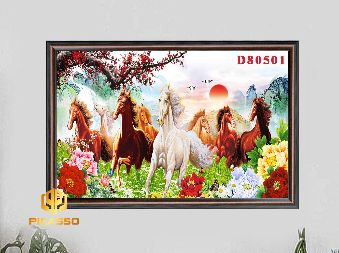 Khung Tranh : Khung tranh được làm từ chất liệu nhựa PVC giả gỗ, họa tiết nổi,màu sắc chân thực, Bản khung tranh 8cm